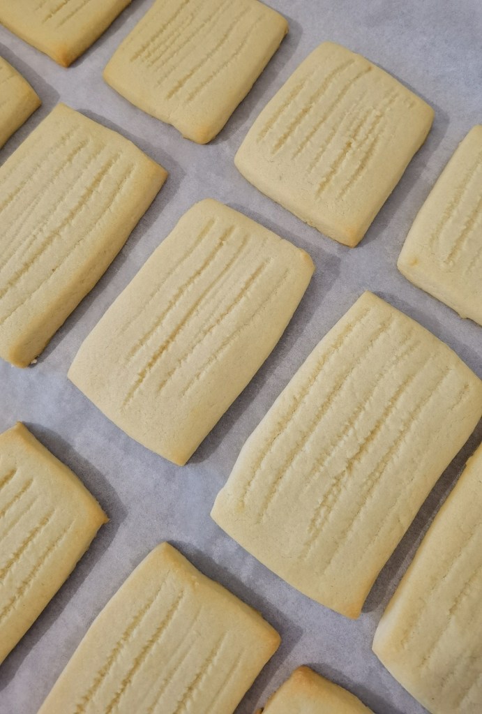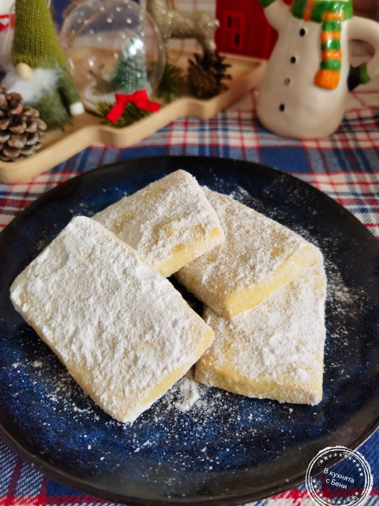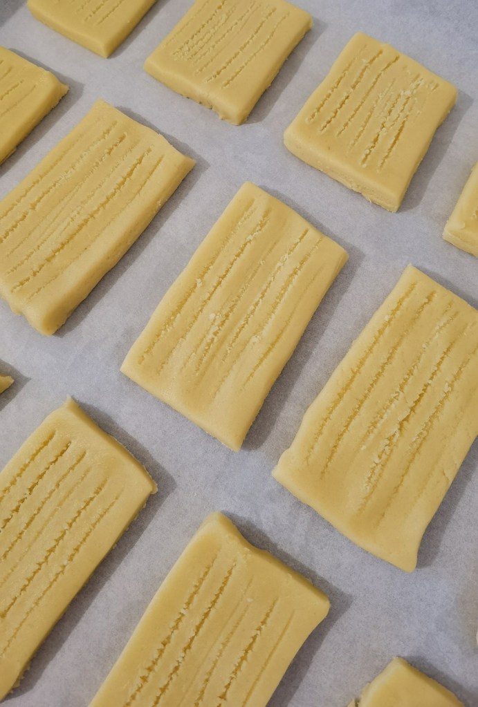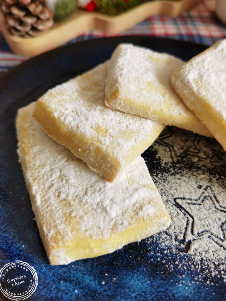 В купа сложих мекото масло, пудрата захар и ванилиите и с кухненска бъркалка ги разбърках до гладка смес. Добавих яйцето, което бях извадила малко по-рано, за да бъде със стайна температура и разбърках до усвояването му от сместа. Брашното пресях и постепенно го добавих, като целта е да се получи меко тесто, което може да се точи. Именно затова количеството на брашното може да варира с 1 до 2 с.л. В самата купа оформих тесто, което преместих върху кухненския плот и доомесих за кратко. Леко набрашних плота и разточих тестото с дебелина 6-7 мм., но не по-тънко. Изрязах правоъгълни бисквити, по повърхността на които направих леки бразди с вилица и ги разположих в голямата тава на фурната, която предварително покрих с хартия за печене. Изрезките от тестото омесих, разточих и изрязах и процедирах така до пълното му изчерпване.