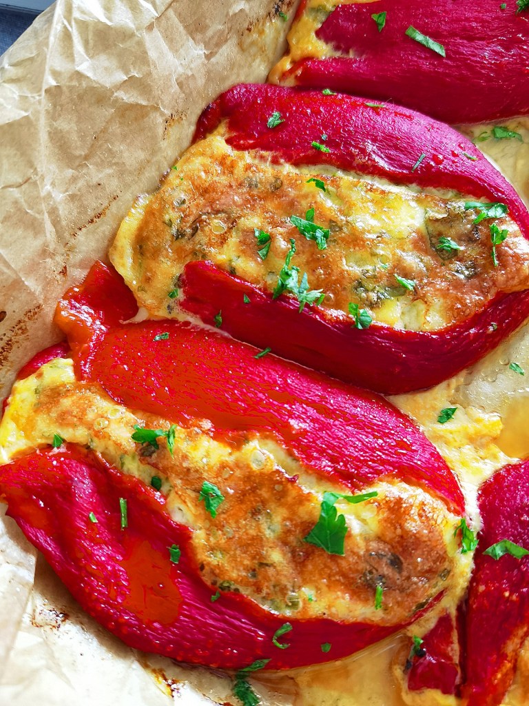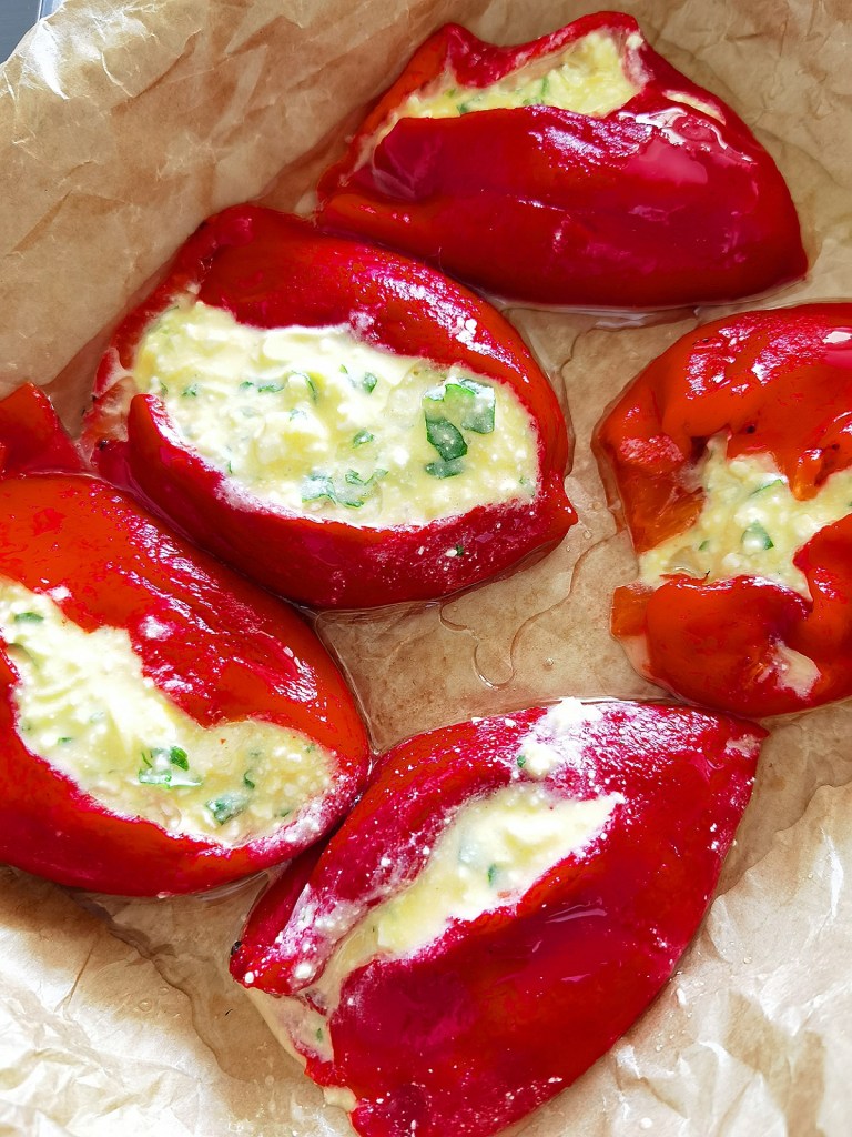 Междувременно загрях фурната на 200 градуса. Малка тава с размер 25х20 см. покрих с хартия за печене, която леко намазах с олио. В отвора на всяка чушка сложих от сместа, така че хем да е пълна, но и да не прелива. Напълнените чушки подредих в тавата и ги покапах с малко олио, след което ги сложих да се пекат в напълно загрятата фурна за около 20 минути или до апетитен загар на плънката.