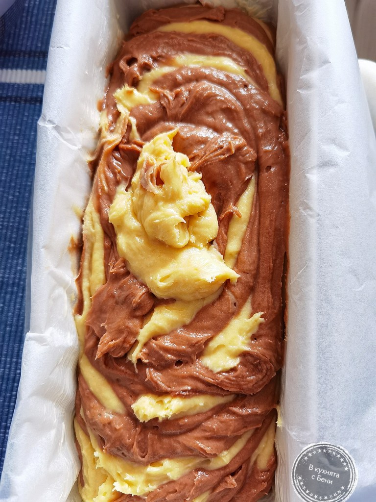 Форма с размери 30х11 и височина 7 см. покрих с хартия за печене, която намазах с меко масло. В средата й сложих пълна лъжица от светлата смес, а след това върху нея добавих лъжица от тъмната смес. Продължих, слагайки точно в средата на сместа от тази с противоположния цвят, докато се изчерпат и двете смеси. Когато това се случи, хванах двата края на формата и с поклащащи на страни движения, разпределих сместа в целия съд.