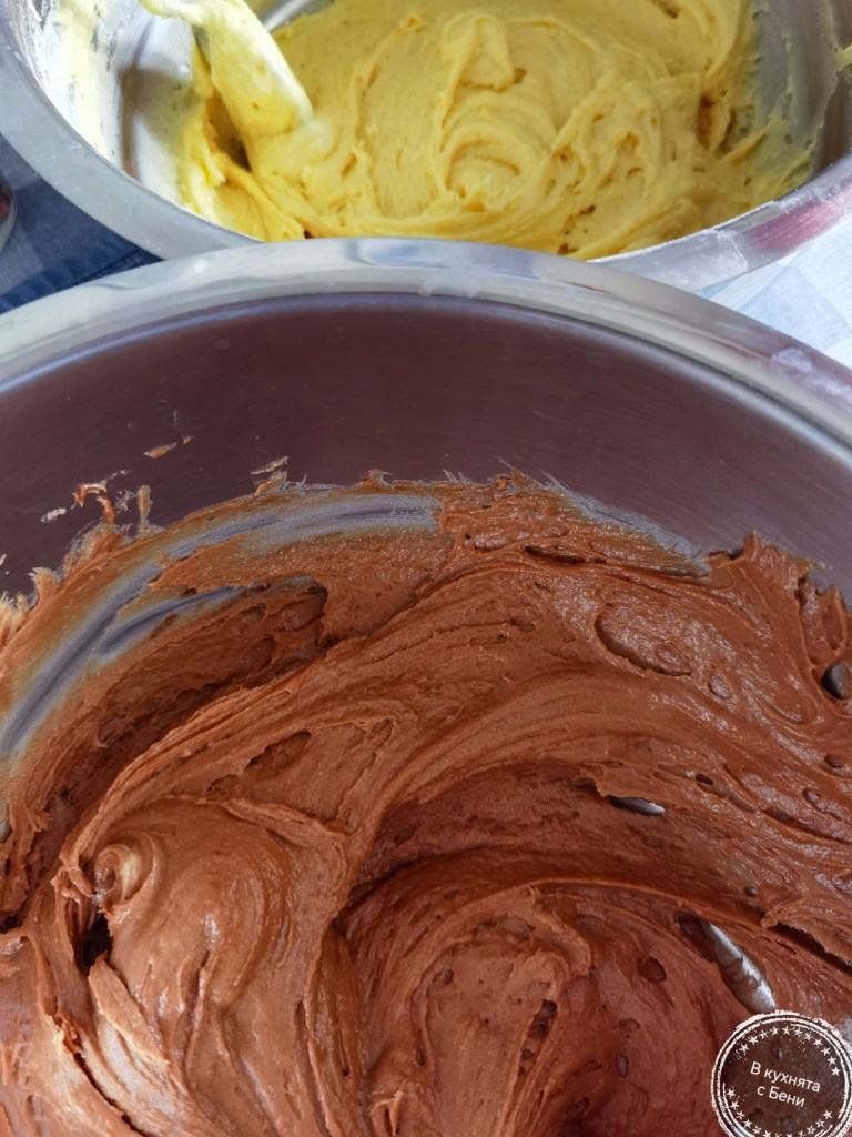Половината от сместа сложих в друга купа и към нея добавих охладения шоколад, след което разбърках до усвояването му.