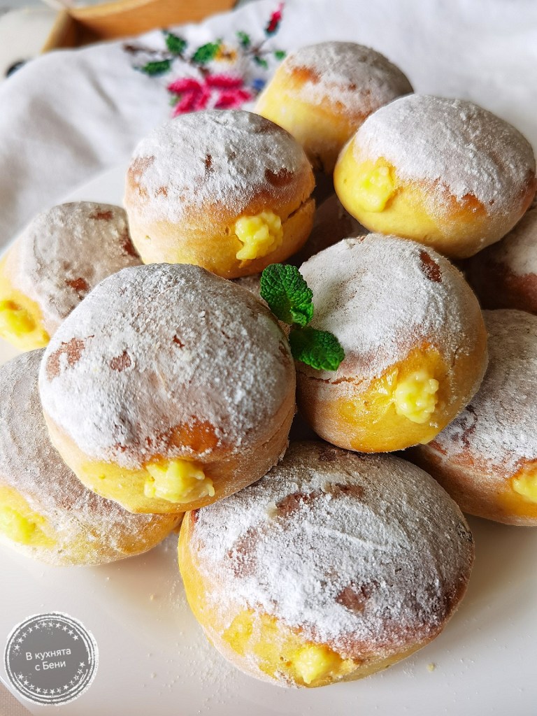 Когато всички понички бяха напълно изстинали ги напълних с крема. Използвах шприца с издължената приставката. Овалях ги в пудра захар и бяха готови за хапване.