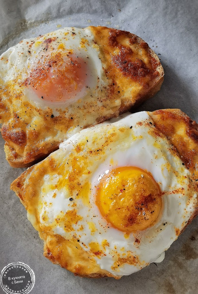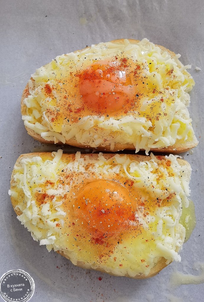 Тава покрих с хартия за печене, която намазах с масло само на мястото, на което ще сложа филиите. Поставих ги и върху тях разпределих настъргания кашкавал, като в средата оставих празно място за яйцата. Счупих внимателно яйцата, като е възможно част от белтъка да се разлее, но това да не ви притеснява. Може с прибор да го върнете на място, а остатъка върху хартията ще се изпече и пак ще е вкусно.
