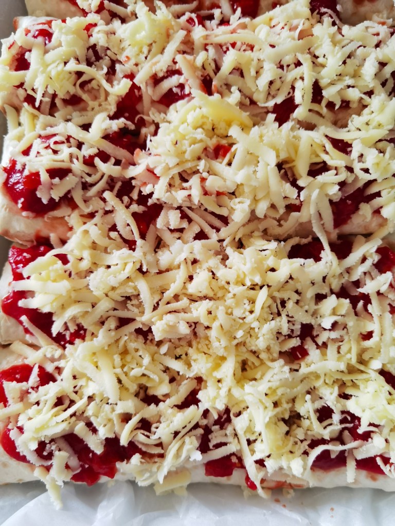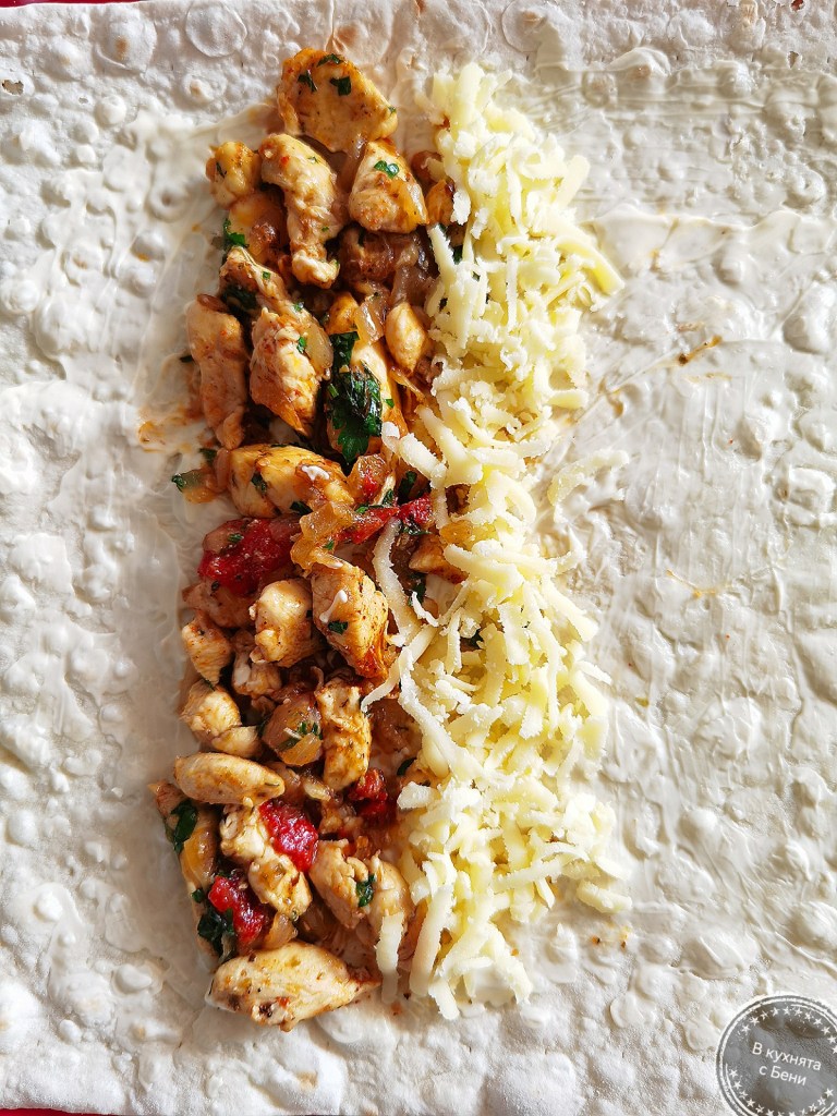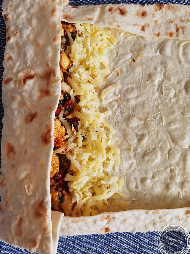 Взех един лаваш и го намазах с 1 и ½ ч.л. майонеза. В единия му край разположих от сместа от тигана и малко от настъргания кашкавал. Прегънах двете страни, за да не изпада плънката и навих на руло, което поставих в тавата. Ако лаваша е малко по-сух е възможно леко да се напука, но това не е проблем. Така приготвих и останалите рула.