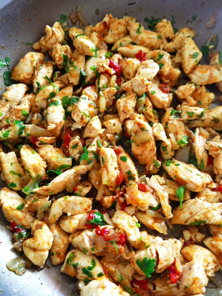 Пилешкото филе измих, подсуших и нарязах на малки парченца. В тиган загрях 4 с.л. олио и запържих лука до апетитен загар, като го посолих. След това прибавих пилешкото, посолих и готвих, разбърквайки до приятен загар и видима готовност на месото. Не трябва да се пресготвя, а да остане сочно.