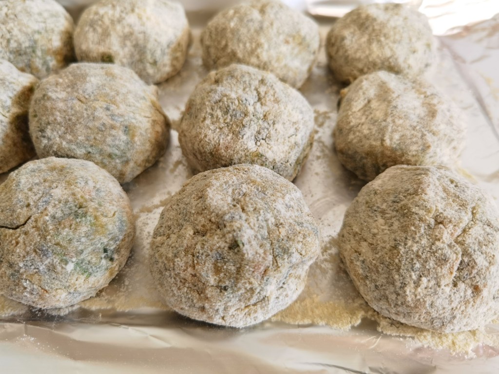 Върху парче алуминиево фолио сложих около 1/3-та чаша брашно. С лъжица взимах от сместа и с набрашнени ръце и овални движения оформих кюфтета, които овалях в брашно и ги подредих в подходящ съд. Сместа е лесна за работа, но и мека, поради което трябва да се действа бързо и без да се натискат твърде много кюфтетата, а с прехвърляне от едната длан в другата.