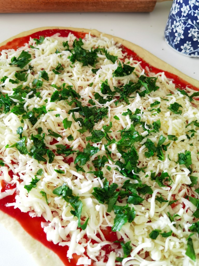 Намазах го със смлените домати и поръсих с ригана. Разпределих равномерно настърганите кашкавал и моцарела и накрая поръсих с нарязаната на дребно листна част на магданоза. Внимателно навих на дълго руло, което нарязах на 8 малки рула с широчина около 4,5 см. Тава с размер 25х30 см. покрих с хартия за печене, която намазах с малко от разтопеното масло. Разположих рулата легнали и ги намазах отгоре и отстрани с разтопеното, топло масло. Сложих ги да пекат в загрята на 180 градуса за около 20 минути или до видима готовност и апетитен загар.