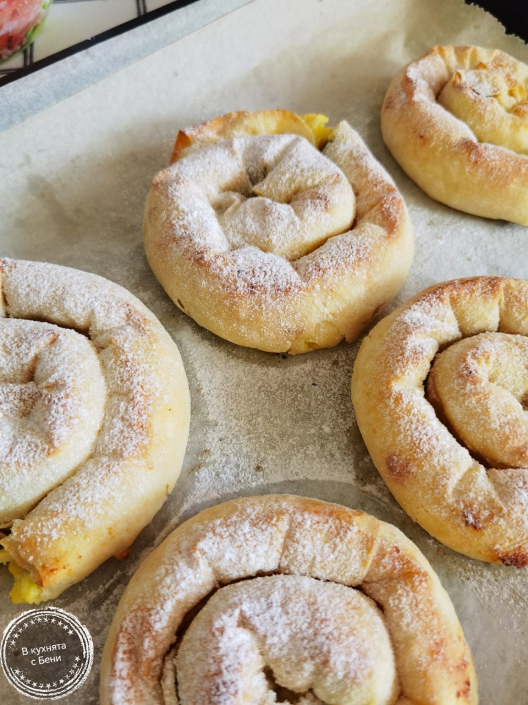 Горещи ги намазах с останалото масло. Леко охладени ги поръсих с пудра захар и поднесох. Докато са леко топли са по-хрупкави. След като изстинат и престоят, омекват, но вкусът им също е прекрасен!