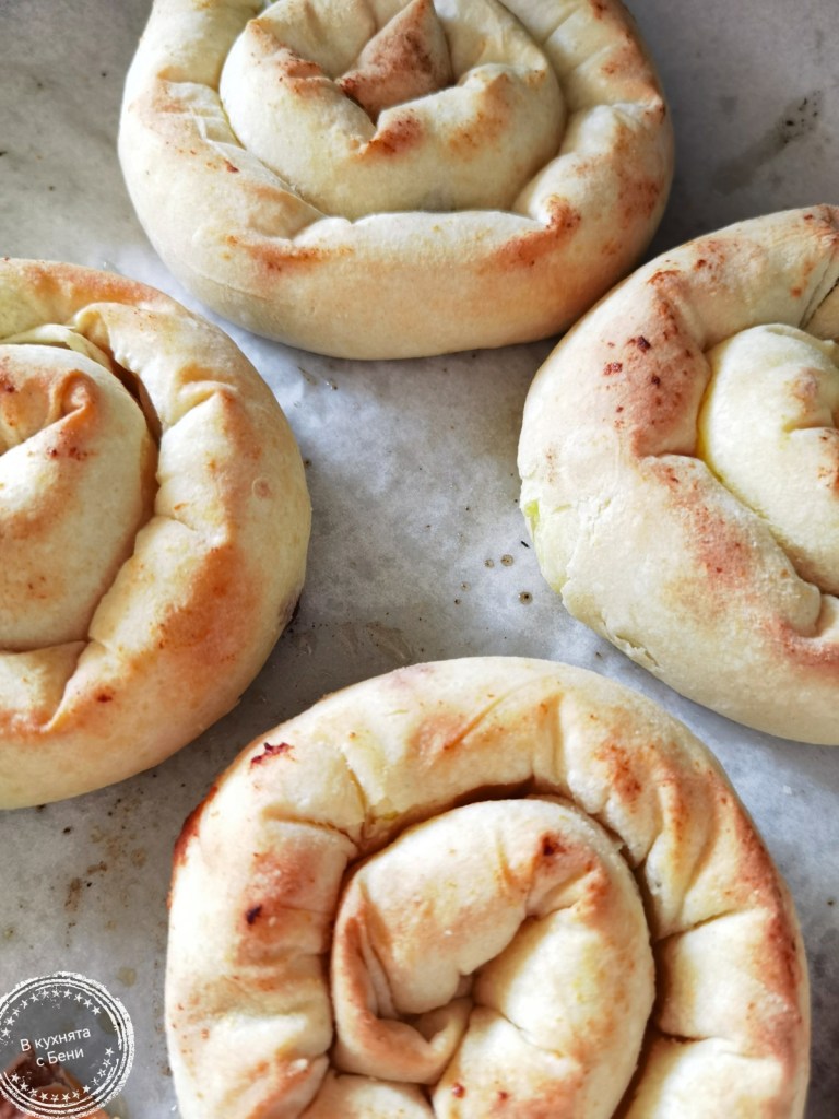 По този начин приготвих и останалите. Намазах ги с по-голямата част останалото масло и сложих да се пекат в напълно загрятата фурна за 30 минути или до апетитен загар.