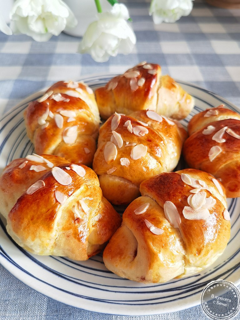 Завих ги от широката страна към тясната, като леко разширявах в началото, за да се получи по-добра формата на кифличките. И да не се получат перфектни, след печенето ще се оправят. Подредих ги в тавата на фурната и оставих за 20-ина минути да си починат. През това време загрях фурната на 170 градуса. Този път разбърках половин яйце, без да разделям жълтъка от белтъка. Намазах кифличките и ги поръсих с филирани бадеми, които предварително бях намокрила, за да не прегорят. Сложих ги в загрятата фурна и пекох около 30 минути, като на 15-тата добиха апетитен загар и ги покрих с парче алуминиево фолио, за да се допекат добре отвътре.