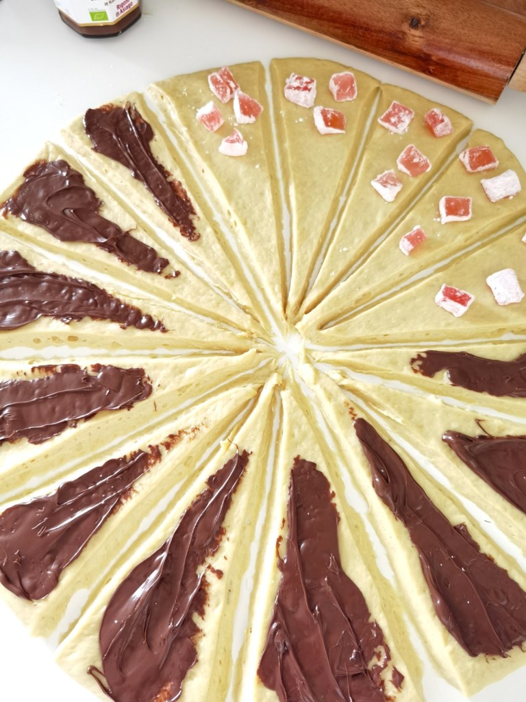 Готовото тесто разточих до диаметър 43 см. и с остър нож разрязах на 15 триъгълника. Повечето от тях намазах с лешниковия крем, а на другите сложих парченца локум.