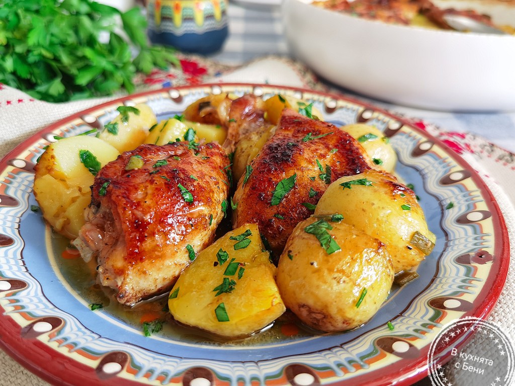 Картофите измих, подсуших и нарязах на половинки или четвъртинки, спрямо големината им. Сложих ги в купа и ги полях с останалото течно масло, след което ги посолих и поръсих с останалия червен пипер. Разбърках добре. Лука нарязах на дребно. Тава с диаметър 31 см. и височина 7,5 см. намазах с малко олио. На дъното разположих лука, върху него картофите, а върху тях пилешкото. Полях с горещия бульон и с бирата. Покрих съда с алуминиево фолио и сложих в загрята на 200 градуса фурна, като веднага увеличих на 220 градуса. Пекох 45 минути, след което махнах фолиото, намалих степента на 190 градуса, облях месото с течността в тавата и леко го побутнах, за да потъне в нея. Пекох още около час, като от време на време поливах месото и картофите със соса. Пилето бе домашно и му трябваше малко повече време, за да стане крехко. Ако ползвате купено от магазина, то ще се сготви много по-бързо. За готовността на ястието съдя по това дали месото се разкъсва лесно при пробождане и картофите се разрязват с лекота. В тавата трябва да остане сос, но да се е редуцирал в голяма степен.