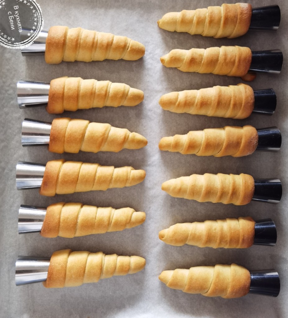 И тук ще уточня, че металните фунийки, които използвах бяха с дължина 12 см. и диаметър в широката си част 2,7 см. Внимателно започнах да завивам всяка тестена лента от острата към широката част, като застъпвах тестото. На снимките се вижда добре. Така подготвените фунийки разположих в тавата и сложих да се пекат в загрятата фурна за около 10-11 минути или лек загар.