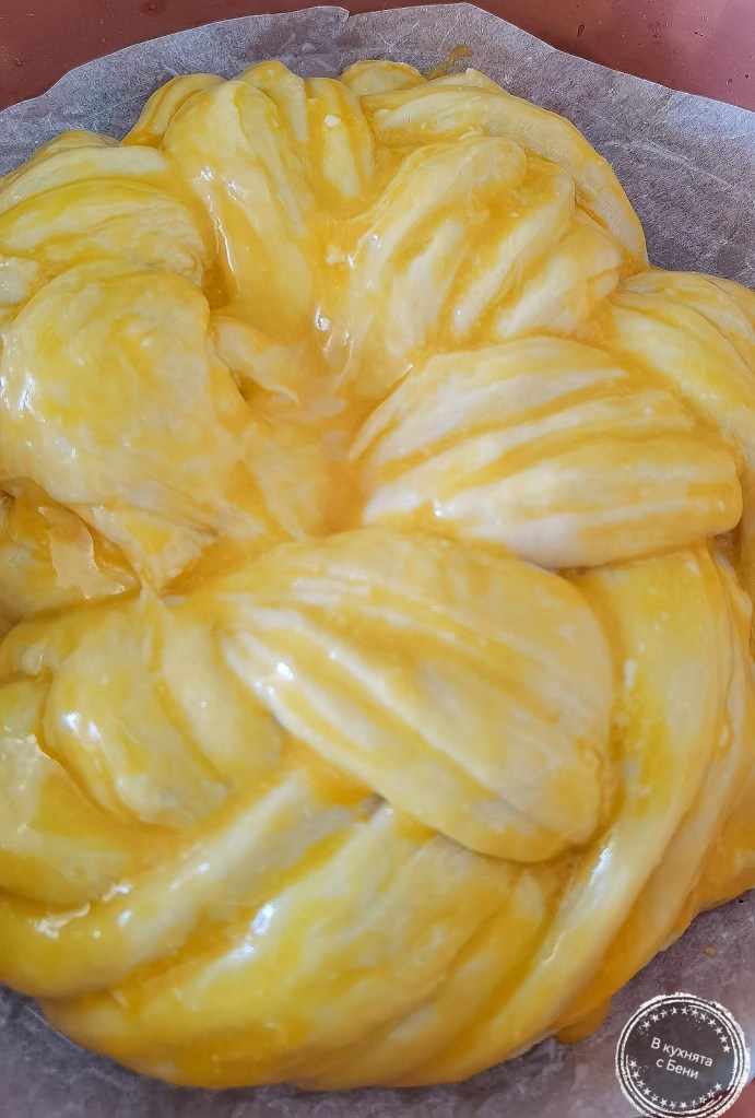Завих я на охлюв и преместих в глинения съд, който бях покрила с кръгло парче хартия за печене. Отделения жълтък смесих с малко от останалото меко масло и намазах питата.