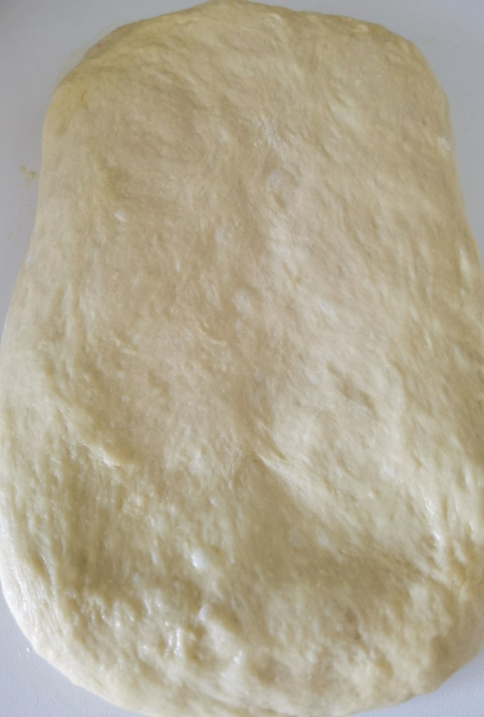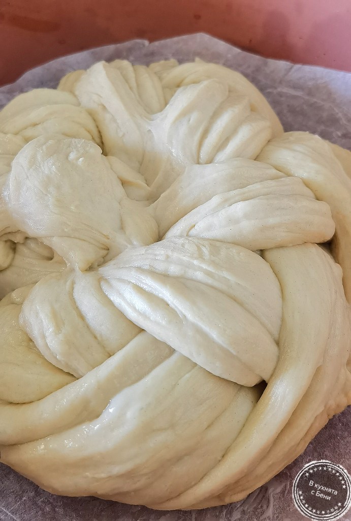 Когато това се случи, добавих шупналата смес при брашното, олиото, млечната смес. От двете малки яйца отделих единия жълтък, а белтъка и цялото яйце разбърках леко и добавих към сместа. Разбърках добре и прехвърлих тестото на плота. Използвайки отделеното брашно омесих меко тесто. Ако лепне, добавете още малко брашно, но без да се прекалява. Купата намазах с олио, сложи тестото, покрих с фолио за свежо съхранение и оставих да втаса, което при мен отне 1 час.