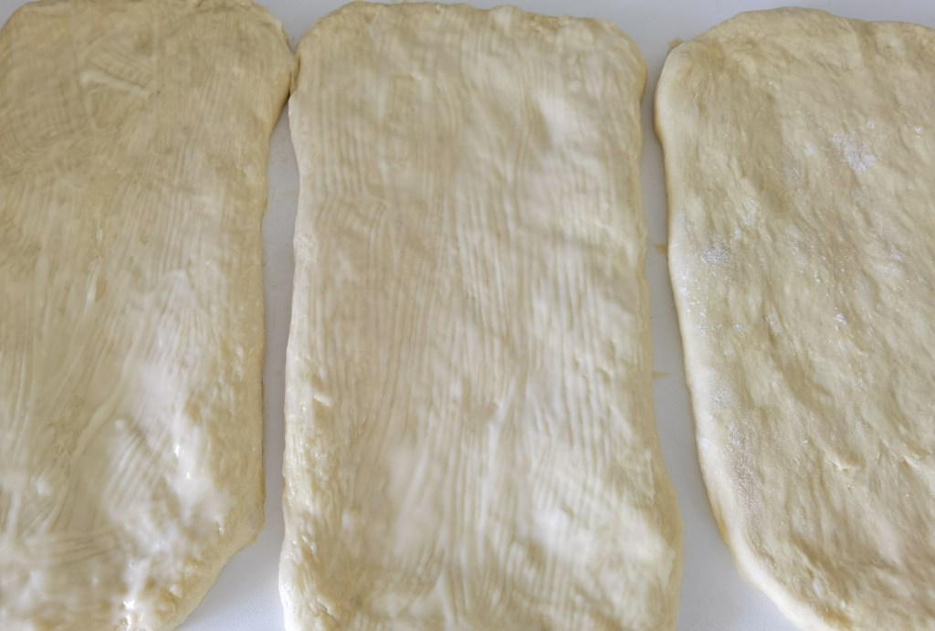 Втасалото тесто прехвърлих на плота и леко премесих. Разделих на три равни части. Всяка от тях разстлах с ръце в продълговата форма и дебелина около 2-3 мм. Първата намазах с меко масло, сложих втората, която също намазах и покрих с третата, която не съм намазвала.