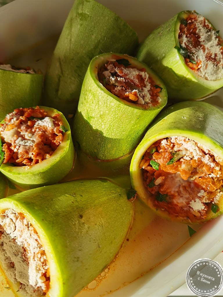 Използвах дълбок съд за печене с размер 22х29х9 см.Тиквичките напълних като поръсих отвора им с малко брашно. Подредих ги полулегнали и ги полях с 1 литър гореща вода. Покапах с още малко мазнина и сложих формата в загрята на 190 градуса фурна. Когато течността завря, покрих ястието с алуминиево фолио и пекох 1 час. След това внимателно обърнах тиквичките и допекох още 10-ина минути, вече без фолио. Важно е в тавата да има течност, с която ще приготвя соса.