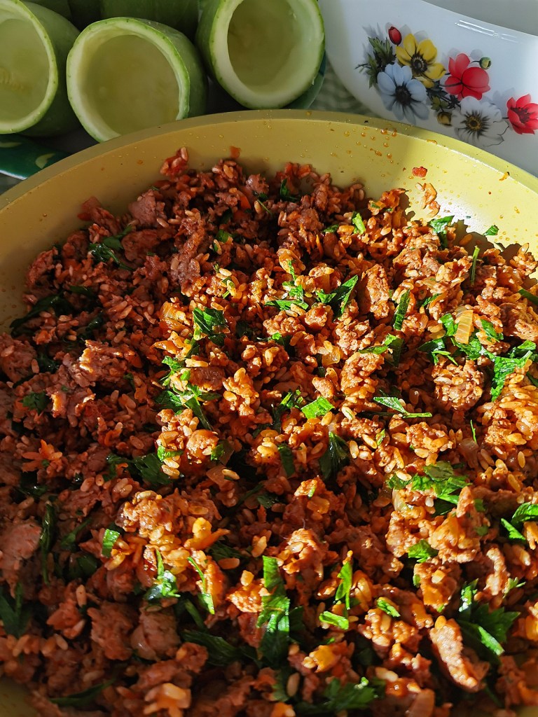 В тиган загрях 4-5 с.л. олио и запържих ситно нарязания лук и настъргания морков, като ги посолих. Когато омекнаха и морковът си пусна красивия цвят, добавих каймата и мления пипер и с вилица разбърках и готвих до раздробяването й и апетитен вид. След като това се случи, добавих доматеното пюре, червения пипер и почти веднага след това и измития и отцеден ориз. Разбърках, посолих още малко и след около 2 минути плънката бе готова. Добавих ситно нарязаната листна част на магданоза и разбърках финално.
