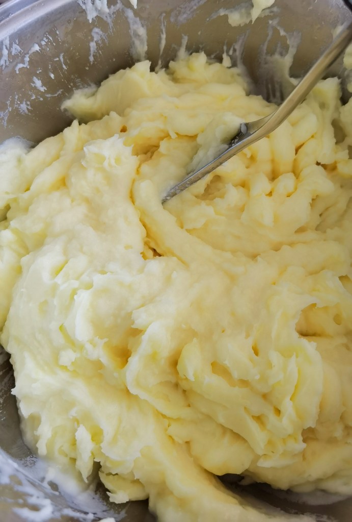 Междувременно приготвих картофеното пюре. Сварих обелените и нарязани на едро картофи с 1 ч.л. сол. Отцедих ги, добавих маслото и част от топлото мляко и с уреда с дупки, ги превърнах в гладко и пухкаво пюре. Добавях от останалото мляко до достигане на желаната гъстота. Посолих на вкус.