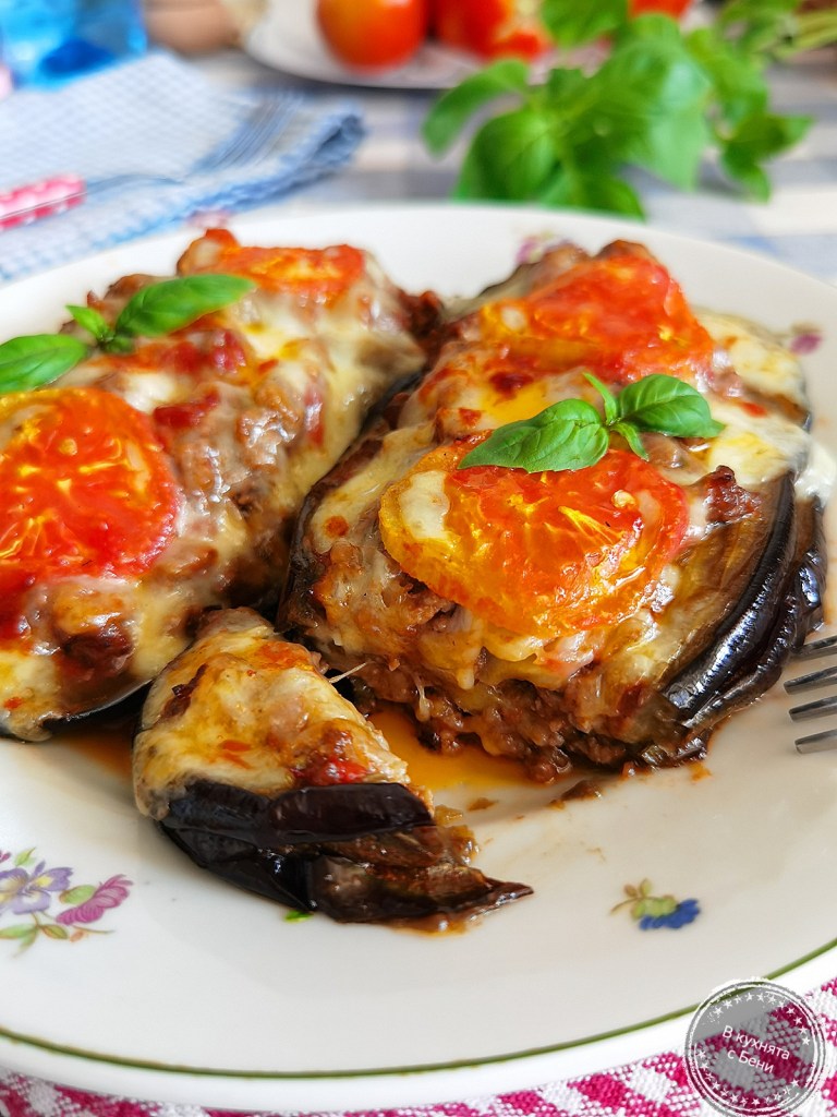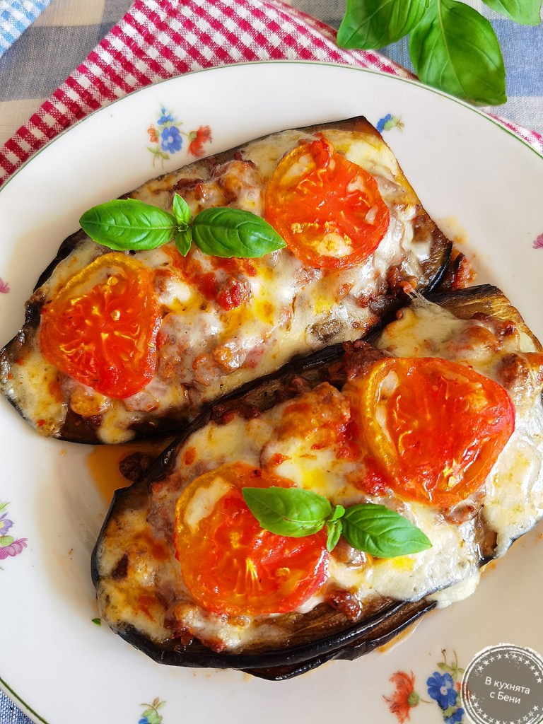 В подходяща тава сложих четири филии патладжан. Отгоре разпределих 1/3-та от мляното месо. Не трябва да се покрива плътно патладжана, а отчасти. Отгоре сложих втора филия патладжан, която като размер и форма да отговаря на тази отдолу. Сложих втората трета от мляното месо и покрих с трета филия патладжан. Завърших с последното мляно месо, което може да е най-малко и разпределих с настъргания кашкавал. Обеления домат нарязах на дънки шайби, които разположих върху кашкавала.