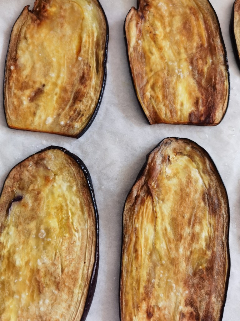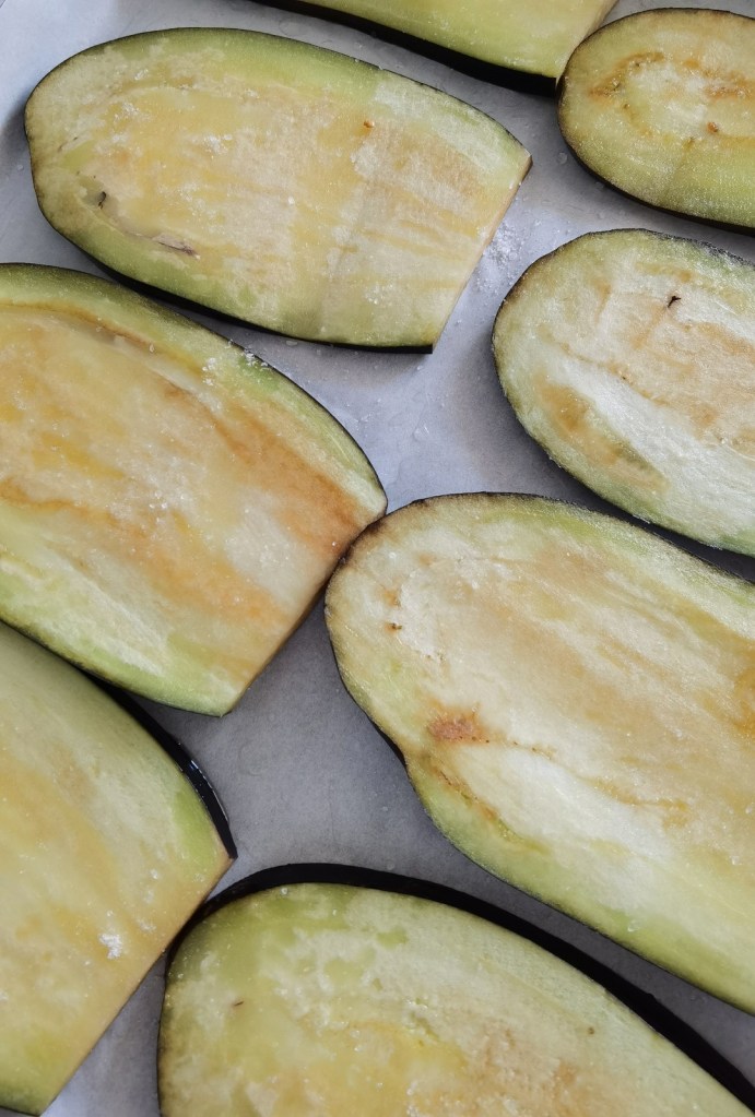 Измитите патладжани нарязах на филии с дебелина около 0,7 см. не трябва да се нито много дебели, нито твърде тънки. Намазах ги от двете страни с олио и сложих в тавата на фурната, която предварително покрих с хартия за печене. Сложих ги в напълно загрята на 200 градуса фурна и пекох до апетитен загар. В зависимост от големината на патладжаните, може да се наложи да се изпекат и на два пъти.