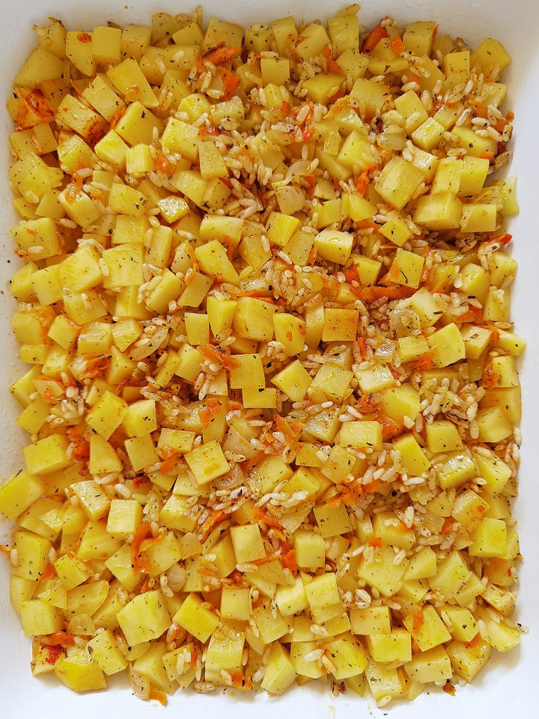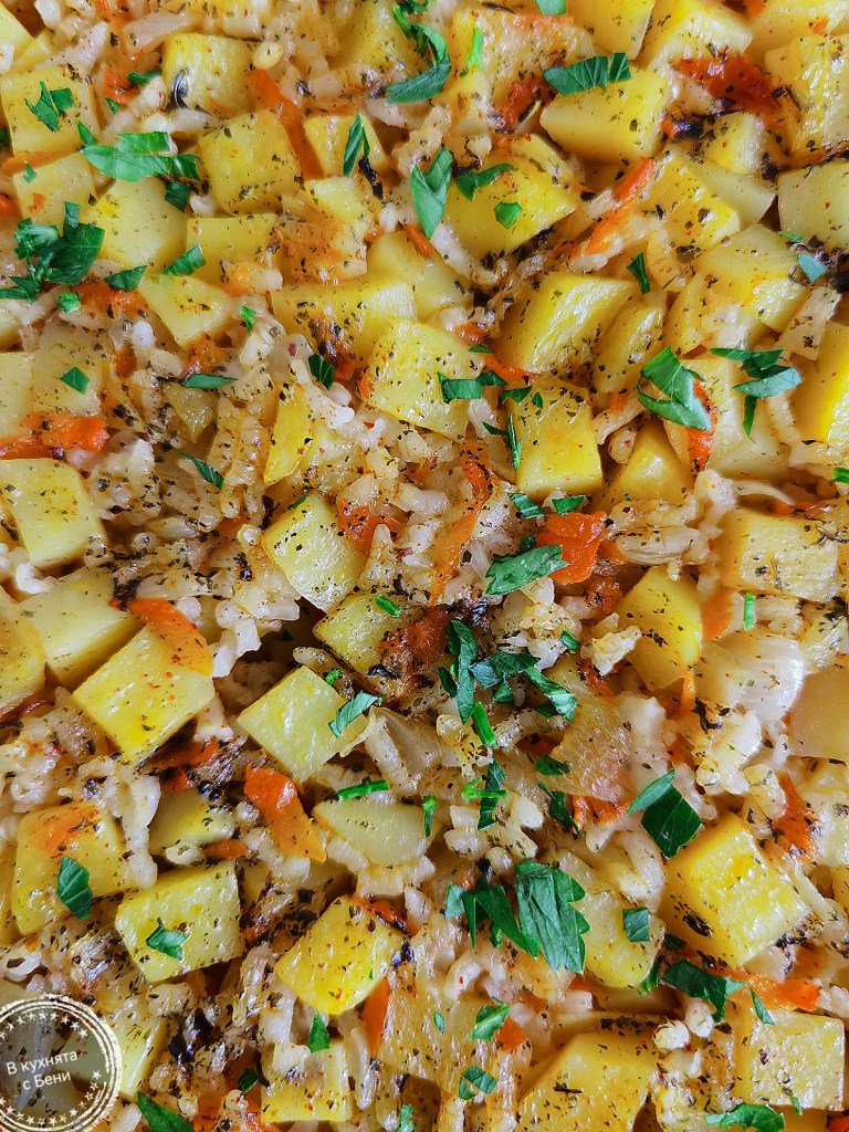 Днес нямах много време за готвене и набързо приготвих това обиктовено, но любимо ястие, което на пръв поглед изглежда като странна комбинация на картофи и ориз, но повярвайте ми, че е много вкусна вегетарианска гозба, която препоръчвам горещо. Картофите стават като масло и поемат от аромата на подправките, които им придават чудесен вкус.😋🥔🥘😍