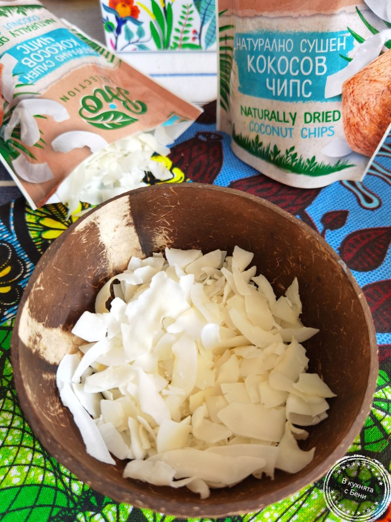 Кокосовия чипс смлях на ситно с помощта на кухненския робот. Може да използвате и качествени кокосови стърготини, но препоръчвам този кокос, при смилането на който се отделя сладък, екзотичен аромат.