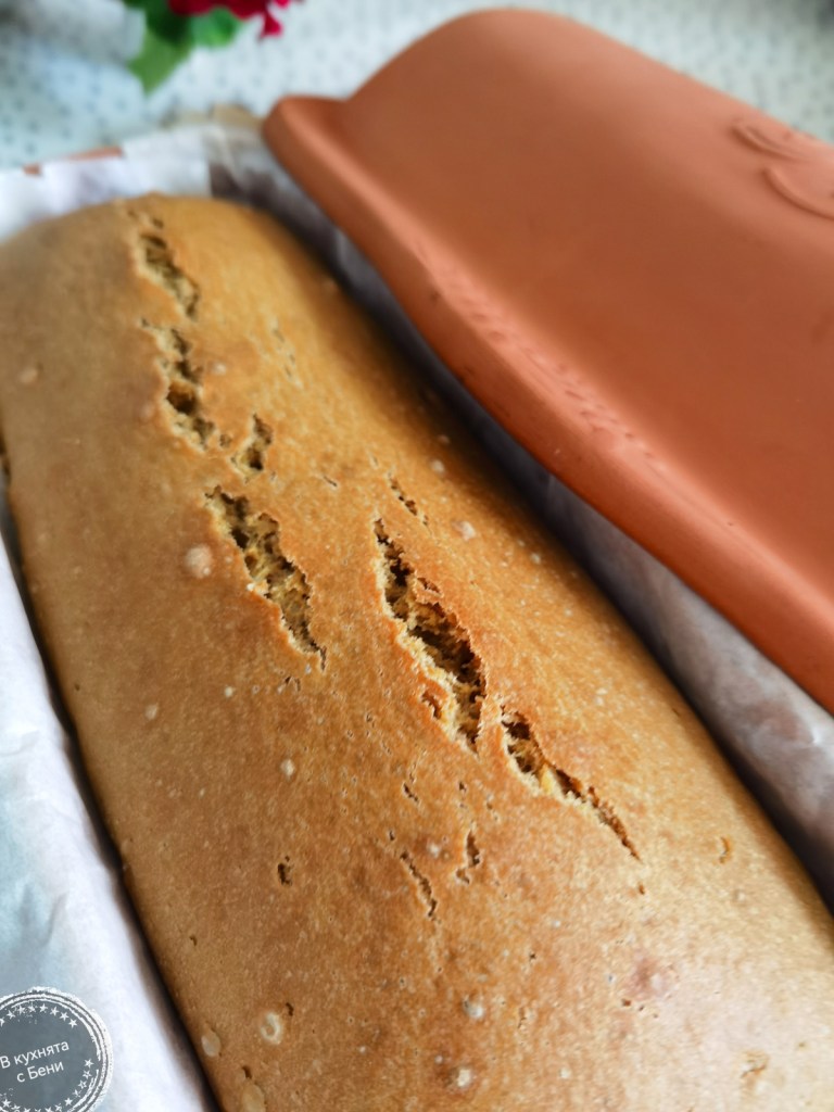 Основата на глинения съд покрих с хартия за печене и я намазах с масло. Сложих я във фурната, както и капака и пуснах да се загреят на 200 градуса. Когато температурата бе достигната, извадих основата на съда и изсипах сместа, разпределяйки я равномерно. Сложих капака и върнах съда във фурната, като от този момент беше нужен точно 1 час за изпичането на хляба. За готовността съдя по вида, както и по сухата клечка, прободена в средата на печивото.