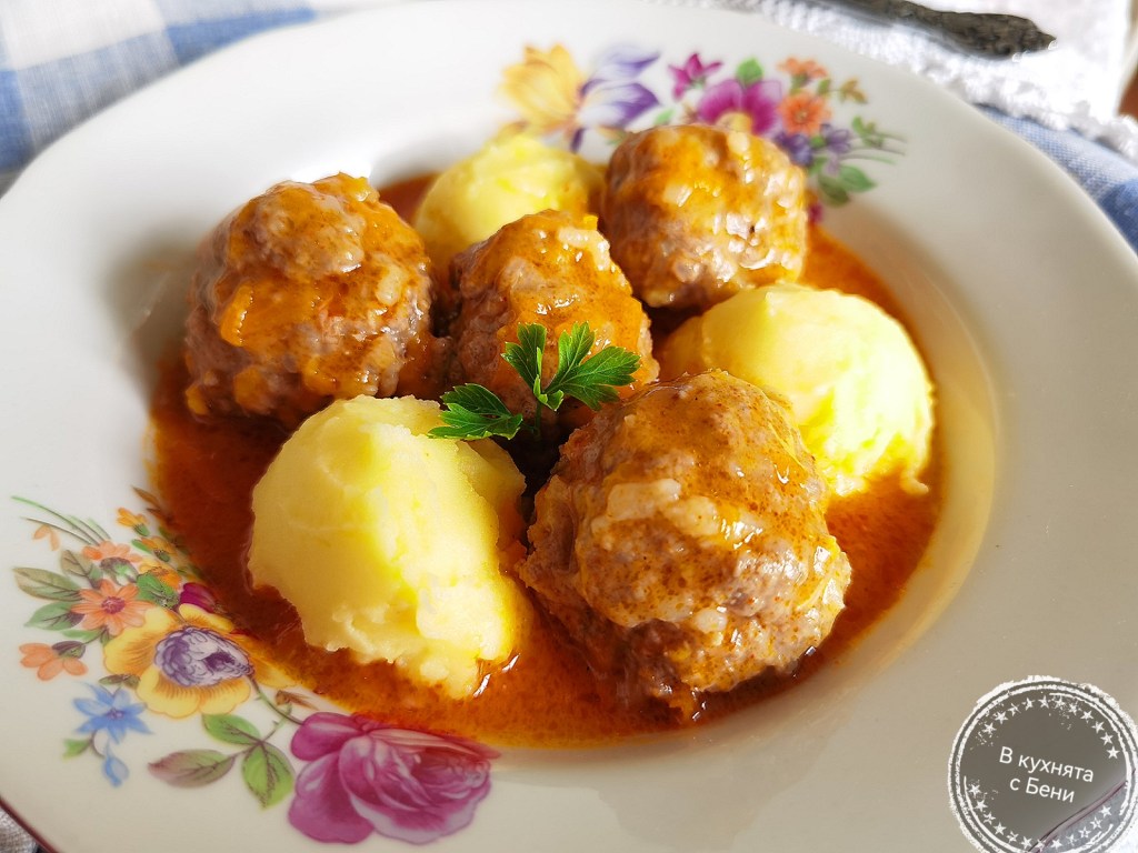 Домашна храна носеща уют сервирах днес на трапезата ни. ☺️🍲🍴Кюфтета със сос, съчетани с картофено пюре приготвих и се получи много вкусно ястие. Направата му не отнема много време и чудесна идея за разнообразяване на седмичното меню.😋🍛
