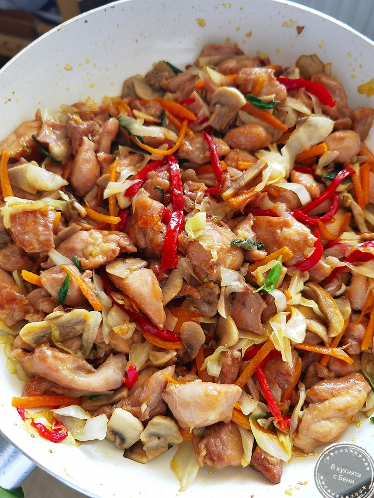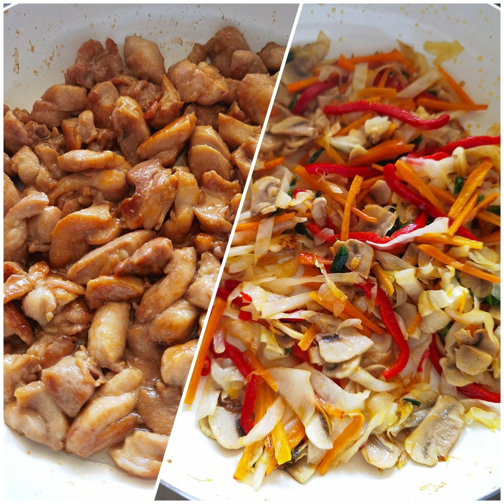 В голям тиган с незалепващо керамично покритие загрях 3-4 с.л. олио и добавих пилешкото. През цялото време на готвене степента на котлона е най-висока. Готвих го, докато се запържи добре, без да се пресготвя, за да остане сочно. Извадих го в чиния, която оставих на топло върху печката.