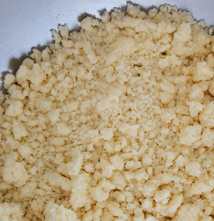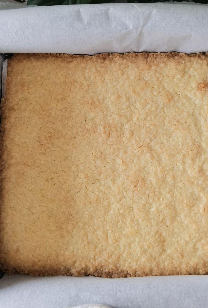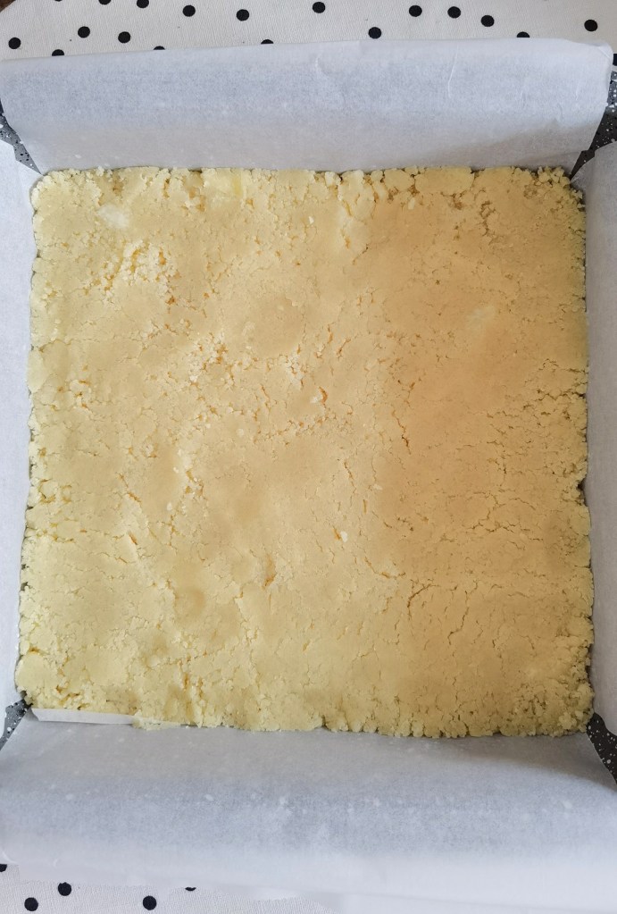 В купа сложих пресятото брашно, солта, захарта и нарязаното на малки парченца студено масло. С пръсти започнах да смесвам продуктите, а след малко и с длани да претривам, превръщайки ги в маслени трохи. Малка форма с размер 20х20х5 см. покрих с хартия за печене. Изсипах сместа и я разпределих равномерно, притискайки я.