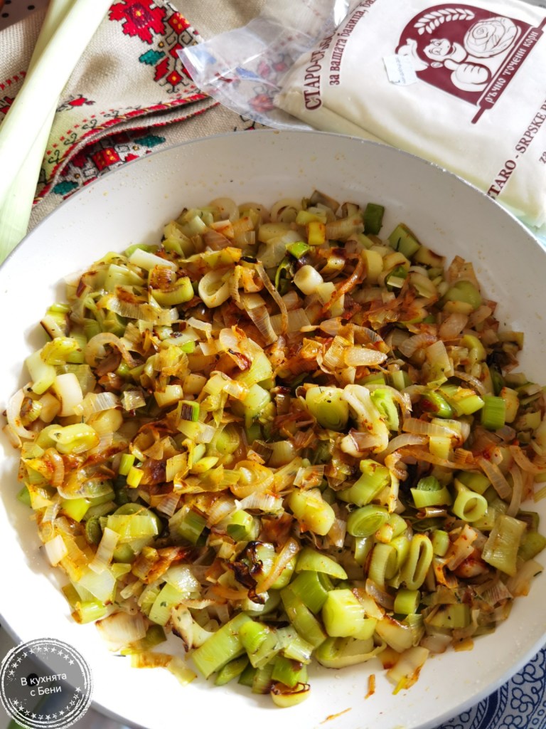 За направата на баницата използвах и бялата и зелената част на праза. Почистих го от външната обвивка, измих и нарязах на колелца с дебелина около 1 см. В тиган загрях 1 с.л. масло и 2 с.л. олио и добавих праза, като го посолих и поръсих със сушената и стрита чубрица. Готвих, докато омекна и доби апетитен загар. Останалото масло разтопих в метално канче и добавих последната лъжица олио.