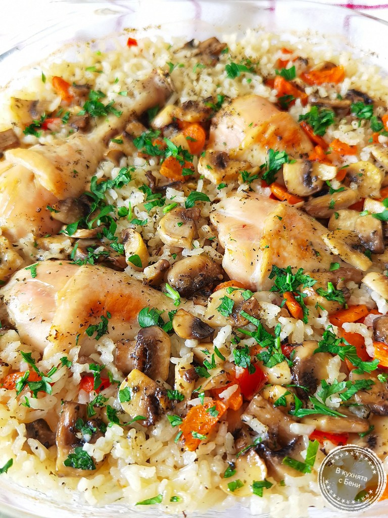 Сместа изсипах във форма с размер 24х24х6 см. Отгоре поставих пилешките бутчета и полях с 3 и ½ ч.ч. от бульона, като го прецедих. Количеството му в милилитри бе 880 мл. Отгоре сложих няколко парченца масло и сложих ястието да се пече в загрята на 190 градуса фурна за около 35-40 минути или до поемане на течността от ориза и до видима готовност. На 20-тата минута от печенето леко разбърках ориза, за да се разпределят добре зеленчуците.