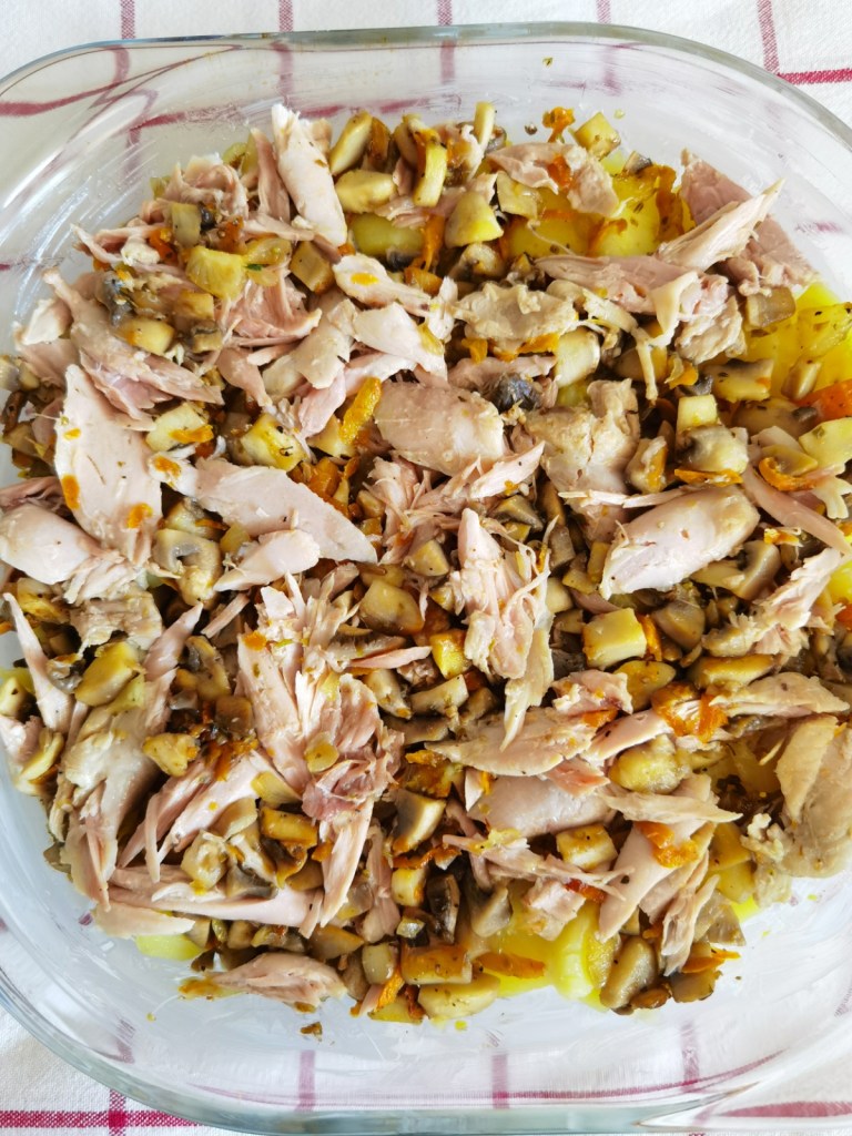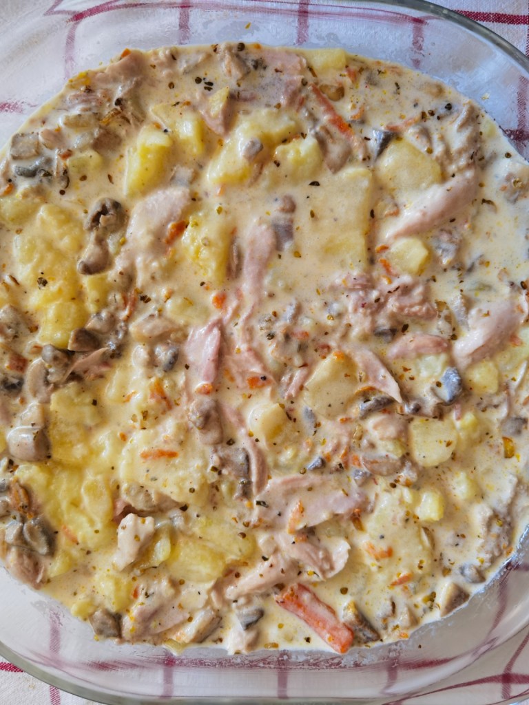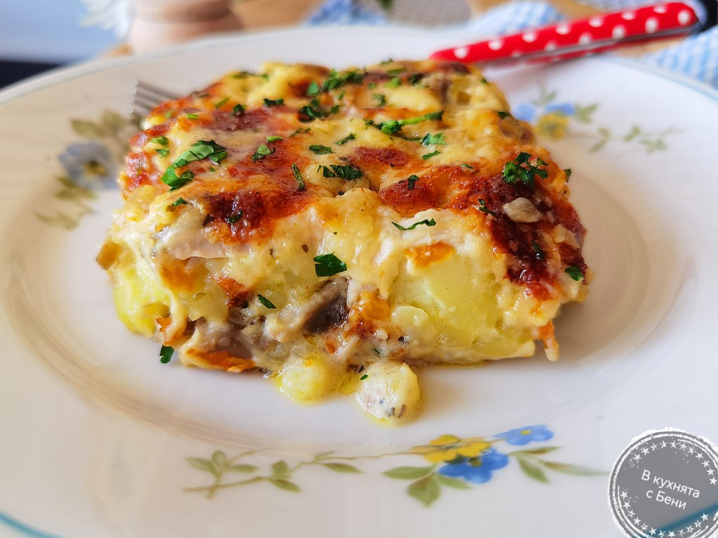 Ястието, което приготвих днес е запеканка с картофи, гъби, пилешко и разни други неща. Много я обичаме у дома и реших да я споделя с вас. 😋🥔🍄🍗😍🍽