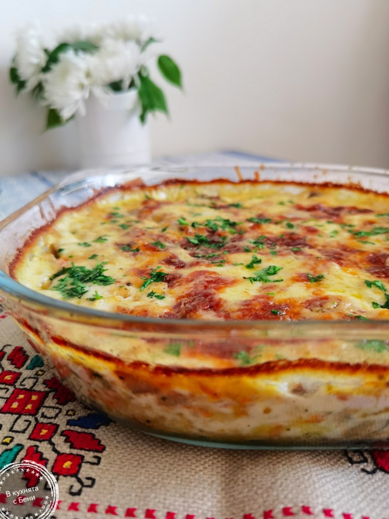 След това поръсих с настъргания кашкавал и допекох до апетитен загар, за около 20 минути. Оставих леко да се охлади и сервирах, поръсено със ситно нарязан магданоз. Ако бързате и сервирате веднага, няма да може да отрежете парче с правилна форма, което няма отношение към вкуса.