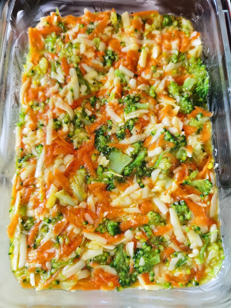 Броколите накъсах на средно големи розички. В малка тенджера загрях вода с ½ ч.л. сол, сложих броколите и ги варих 3 минути или до леко омекване. Отцедих ги в гевгир, след което нарязах на едро и сложих в купа. Моркова и кашкавала настъргах на едро и прибавих при броколите. Яйцата разбърках в малък съд с щипка сол и млян пипер меланж и полях продуктите в купата. Разбърках добре.