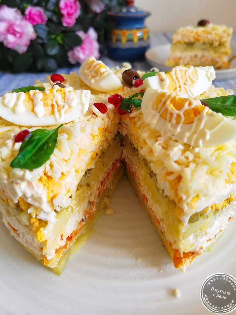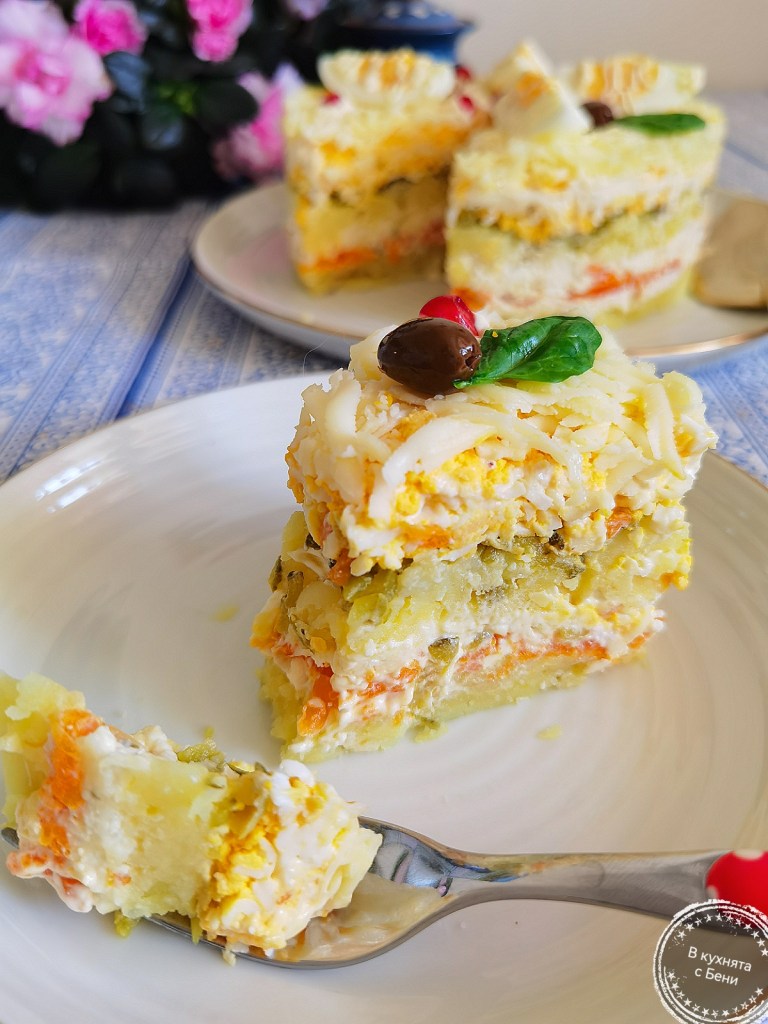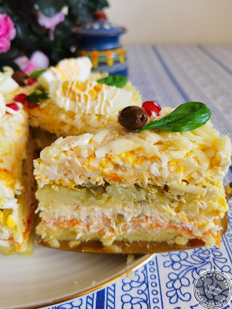 За скъпи гости направих тази редена салата, която се приготвя лесно и се получава много вкусна. Използвах продукти по мой вкус, които се съчетават чудесно.😋🥔🧀😍🍴 Подходяща е и за предстоящите празници с различни декорации и със сигурност присъствието й на трапезата ще предизвика усмивки.☺️🎄