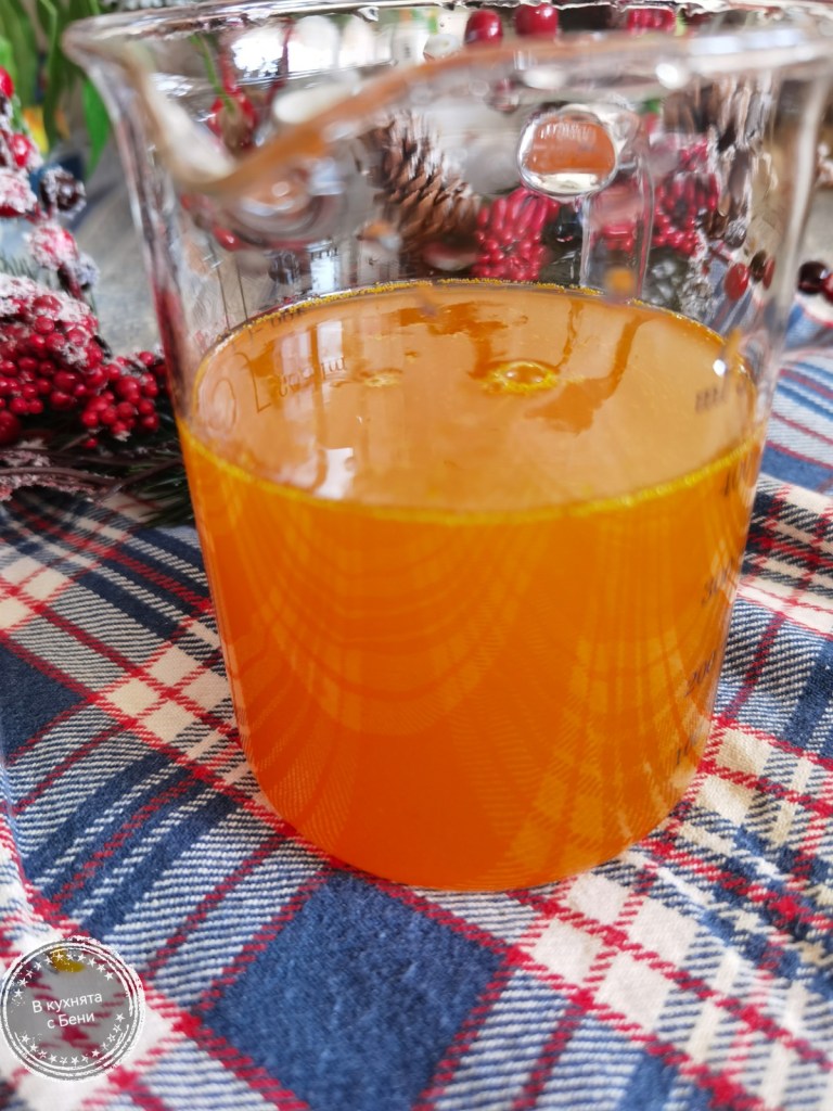 С ръце изцедих престоялата тиква, а сока й прецедих. Получи се 300 мл. Използвах 250 мл., които сложих в касерола, добавих останалата захар, меда, лимоновия сок, пръчката канела и двете карамфилчета. Загрях сместа на котлона и щом завря, намалих степента на 3 от 6 на моята печка и варих 2 минути. След това оставих да се охлади напълно.