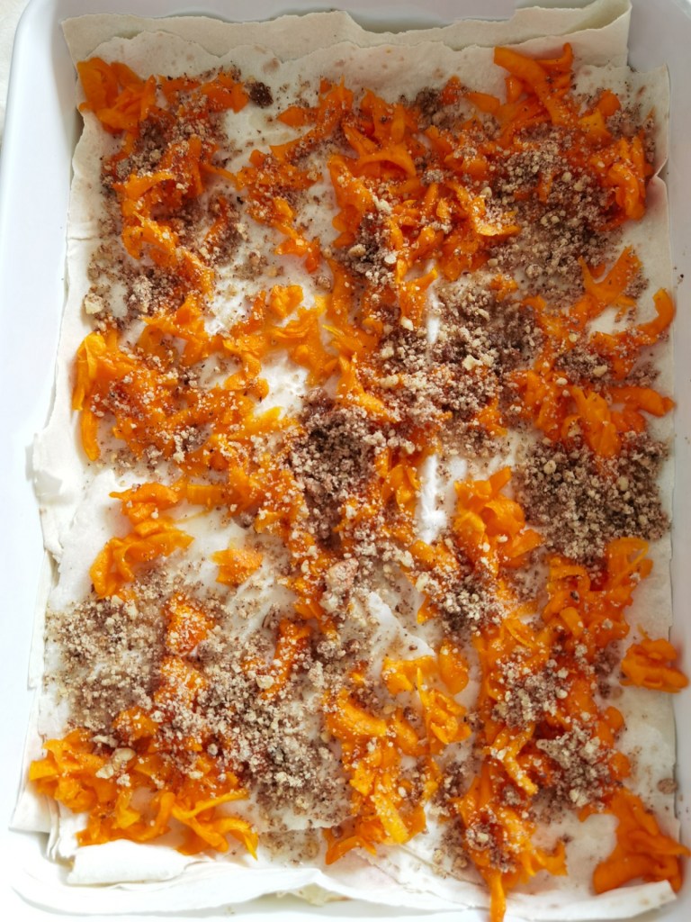 Дъното и стените на форма с размер 30х23х6,5 см. намазах с олио. Корите са големи и кръгли и всяка от тях разделих на две половини. Една такава половина сложих в тавата, като изрязах излишното и го насложих, където беше нужно. Покапах с олио, използвайки силиконова четка, разпределих малко от настърганата и отцедена тиква, като не пропуках и краищата и поръсих с 2 с.л. от орехите. Покрих с втора кора, която също изрязах и сложих спрямо размера на формата. Покапах с олио, сложих по малко тиква и отново орехи. Важно е да не се слага плътен слой тиква, а тук таме! По този начин процедирах и с другите кори, тиква и орехи, като завърших с кора, която намазах с останалото олио. С остър нож нарязах тиквеника на квадрати, като е важно ножа да стига до дъното на формата. Така подредения десерт сложих в загрята на 170 градуса фурна за 35-40 минути или до хубав загар. Важно е корите да са добре изпечени.