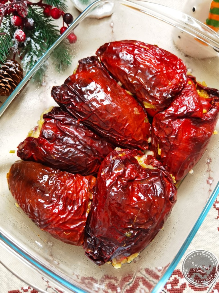 Напълних всяка от чушките, като не ги препълвах. Запечатвах отвора с малко брашно. Напълнените чушки подредих в съд с размер 24х28х7 см. Полях ги с 250 мл. гореща вода, покапах с олио и покрих плътно с алуминиево фолио. Сложих ги да се пекат в загрята на 190 градуса фурна за около 40 минути или до поемане на течността. След това отстраних фолиото пекох още 10-ина минути.
