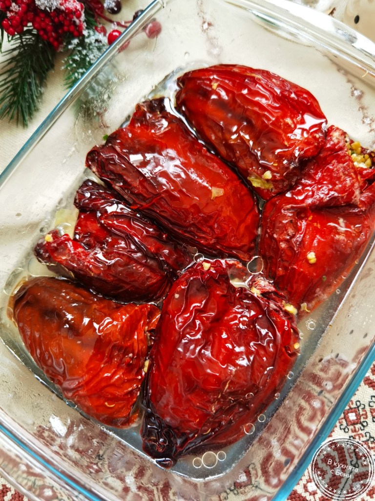 Чушките сложих в дълбок съд и ги полях с вряща вода, която да ги покрива добре. Оставих ги за около 30 минути, за да омекнат.