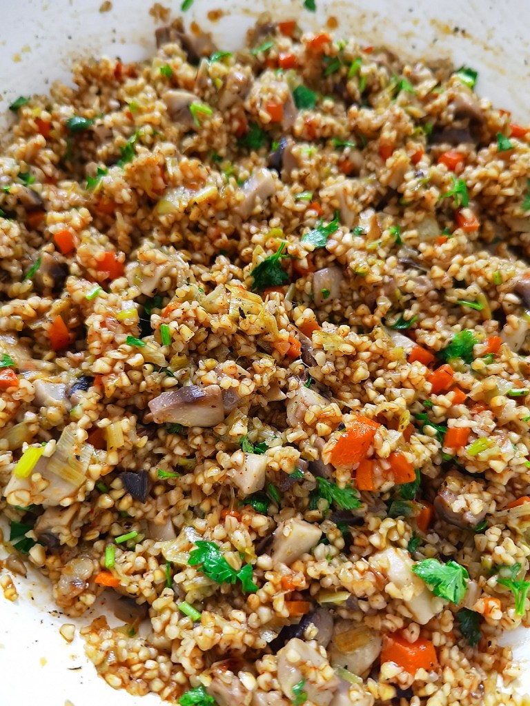 Булгура накиснах в топла вода за 20 минути, след което го отцедих. В тиган загрях 6 с.л. олио и добавих праза, моркова и ситно нарязаните дръжки на магданоза, като ги посолих. Щом започнаха да омекват, прибавих и гъбите, джоджена и мления пипер меланж. Готвих, докато продуктите останаха на мазнина, след което добавих булгура, а след 2 минути и 200 мл. гореща вода. Когато течността бе поета от булгура, отстраних съда от котлона, добавих ситно нарязаната листна част на магданоза и разбърках.