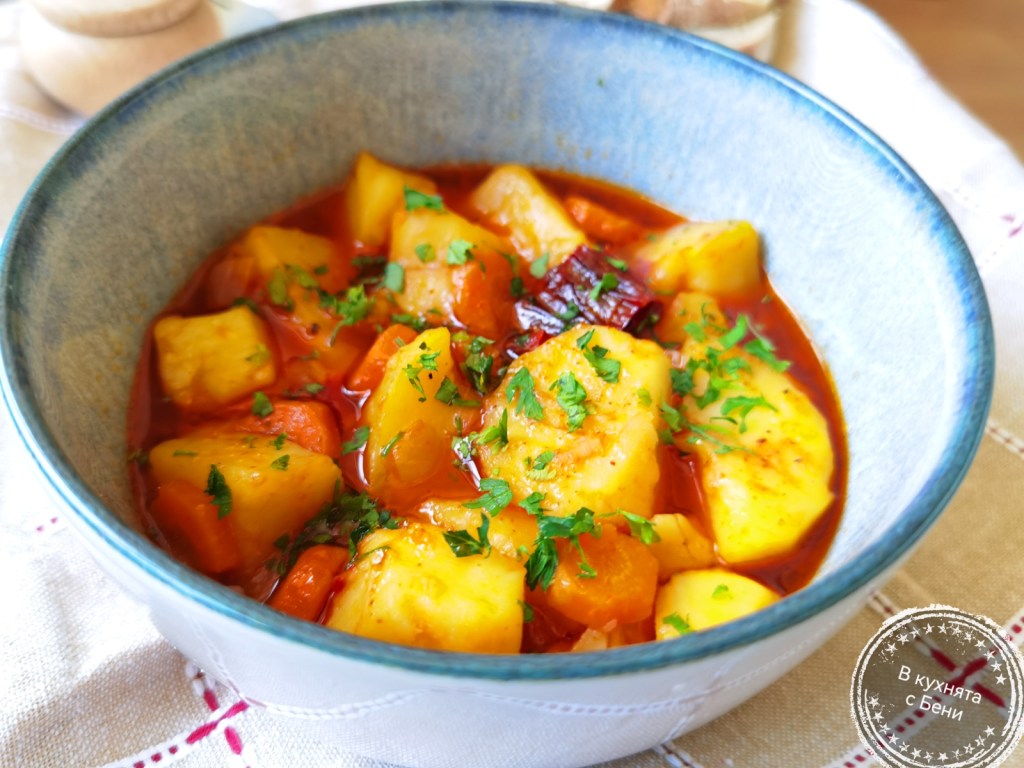 Обелените и измити картофи нарязах на средно големи парчета. Сушената чушка накъсах на едро. В широка тенджера загрях 1 с.л. масло и 1 с.л. олио и добавих лука, моркова и нарязаните на дребно дръжки на магданоза, като ги посолих. Готвих и когато започнаха да омекват и морковът да отделя красивия си цвят, прибавих късчетата чушка и след 3-4 минути добавих и картофите. Посолих, поръсих с мления пипер и червения пипер, разбърках и след половин минута полях с 800 мл. гореща вода, която почти да покрива продуктите. Ястието готвих под капак на 3 от 6 степени на моята печка до пълно омекване на морковите и картофите. Важно е в съда да има сос.