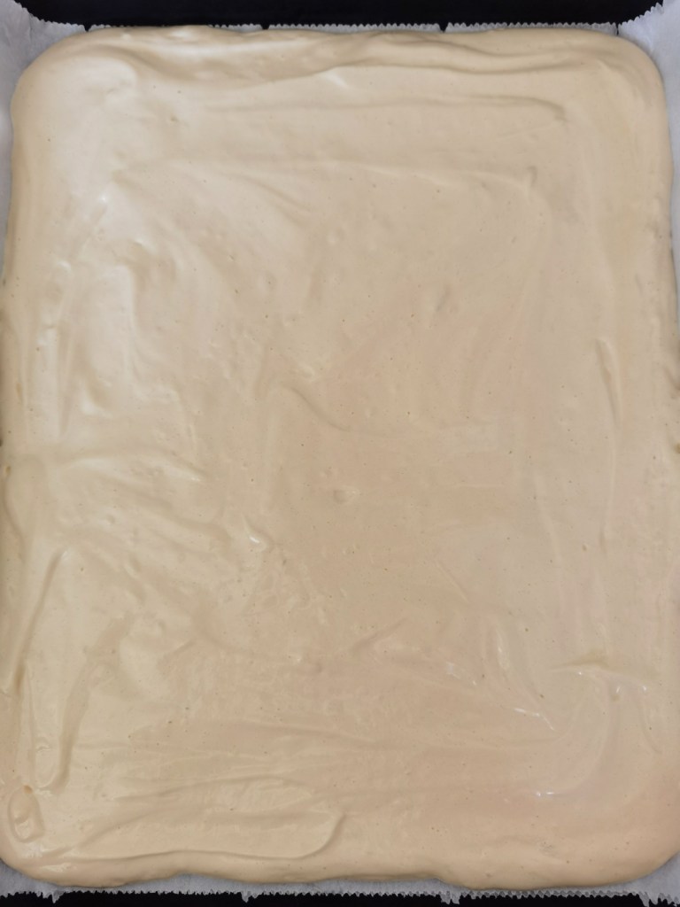 Тавата на фурната, която е с размер 45х33 см. покрих с хартия за печене, която леко намазах с масло. Изсипах сместа и я разпределих равномерно, като се старах да изпълня максимално тавата. Сложих блата да се пече в загрята на 170 градуса фурна за около 13 минути или златист загар и суха клечка, прободена в центъра му. Оставих го да се охлади в самата тава.
