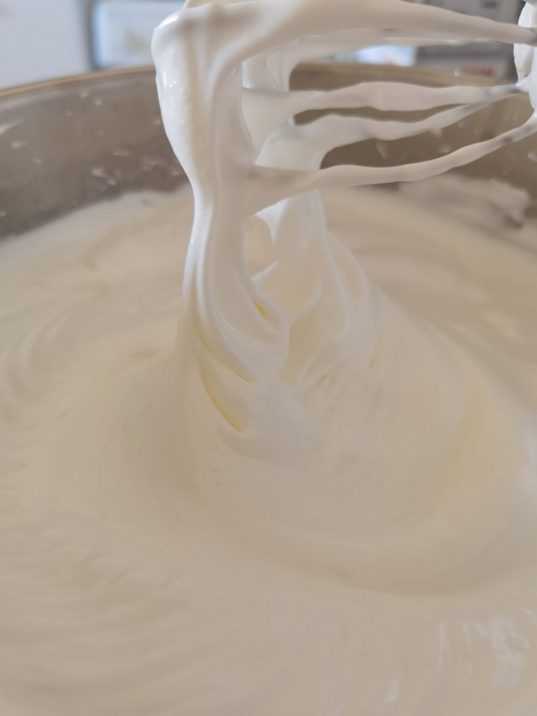 Яйцата разделих на белтъци и жълтъци. Белтъците сложих в суха и дълбока купа и започнах да ги разбивам с миксер. Щом сместа започна да побелява, постепенно прибавих и захарта. Разбих до плътен крем, образуващ меки върхове. Един по един добавих жълтъците, като след всеки разбърквах до усвояването му от сместа. Брашното пресях с бакпулвера и постепенно го прибавих към сместа, като вече разбърквах с кухненска бъркалка, като се старах да запазя въздушността на сместа.