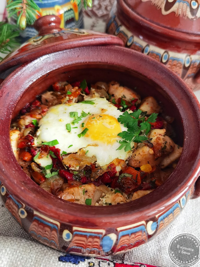 Дъното и стените на две глинени гювечета намазах с масло и разпределих продуктите от тигана. Покрих с капачетата и сложих да се пекат в загрятата на 180 градуса фурна за 15-ина минути. След това направих лека вдлъбнатина в средата на продуктите и сложих по едно яйце. Похлупих с капаците и върнах във фурната за още 15 минути или до желаната рохкост на яйцата.