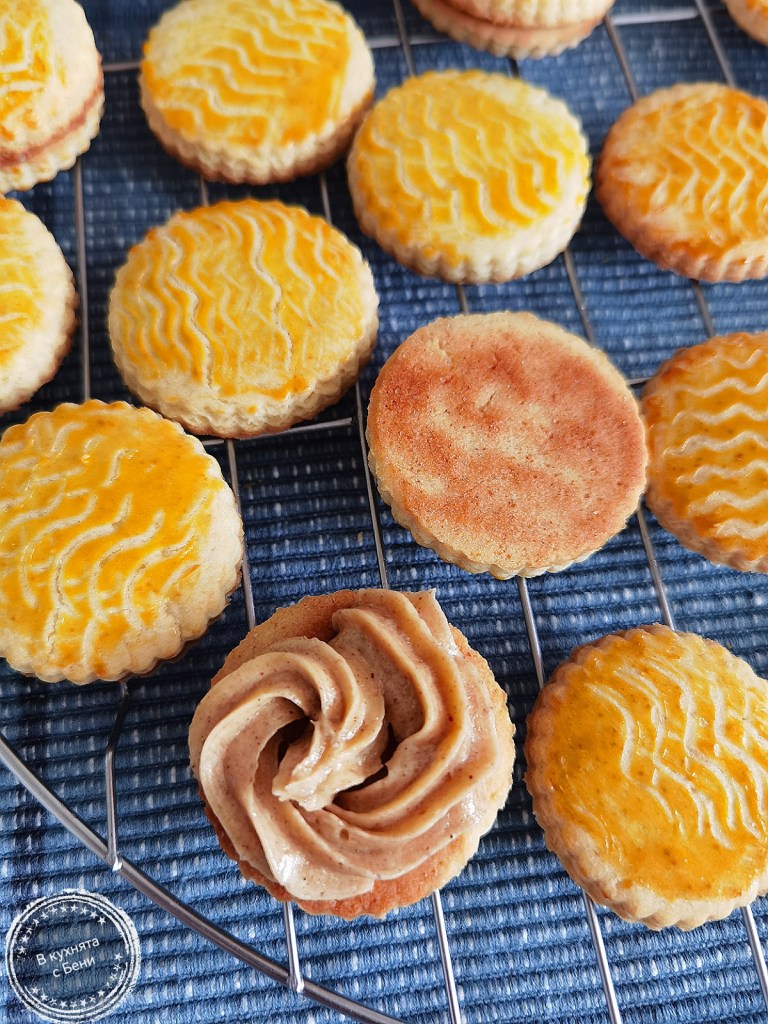 Изпитах затруднение с крема, който се шприцова отлично, но на стайна температура омеква и когато се отхапе бисквитите, той излиза отстрани. Е, това не е голям проблем, тъй като ще си го хапнем, но искам да го уточня. Ако пък приберем бисквитите в хладилника, кремът ще се стегне перфектно, но и бисквитите ще станат по-твърди, защото съдържат масло, което допълнително се стяга от студеното.