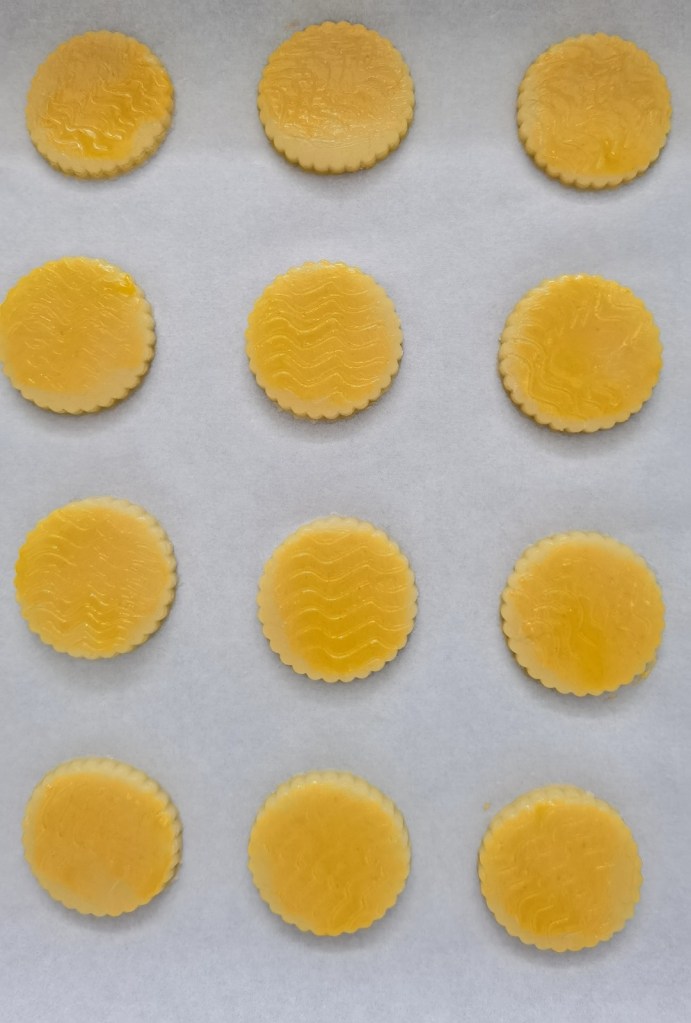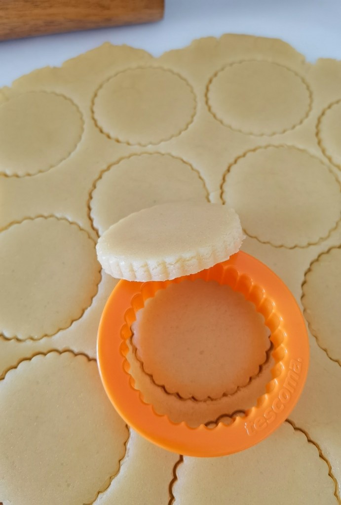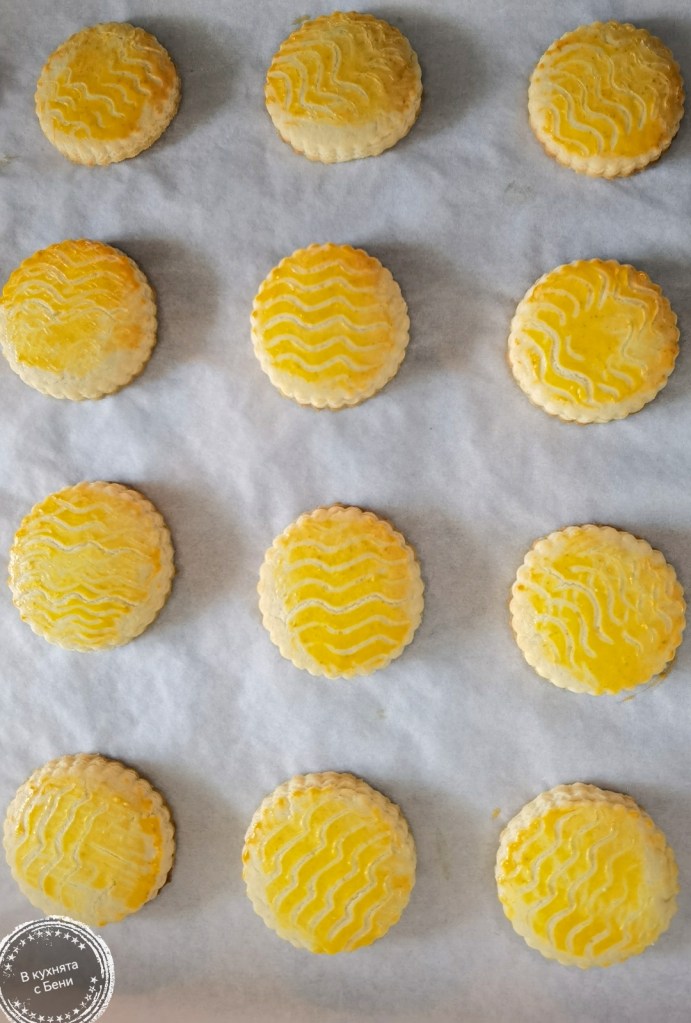 След това време разположих тестото между два листа хартия за печене и го разточих до дебелина 5 мм. С ринг с диаметър 4,5 см. изрязах бисквити, които разположих в тава, покрита с хартия за печене. Бисквитите намазах с жълтък и направих ивици за по-автентичен вид.