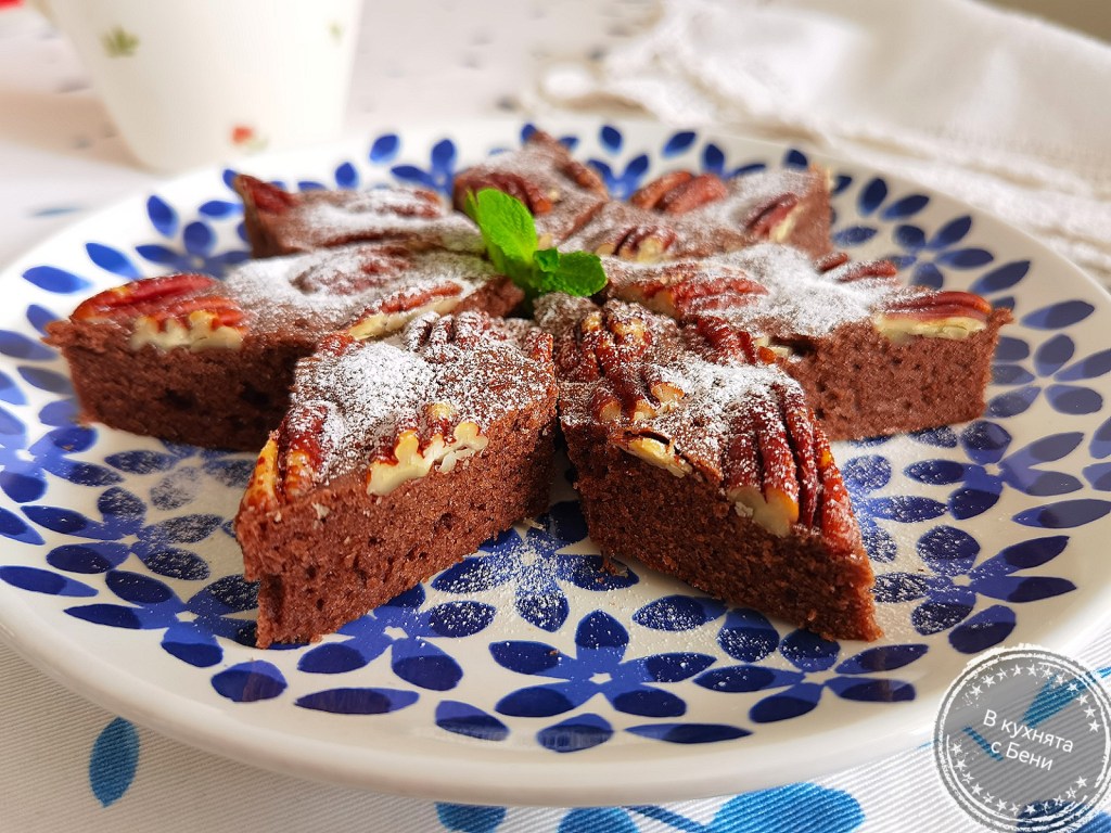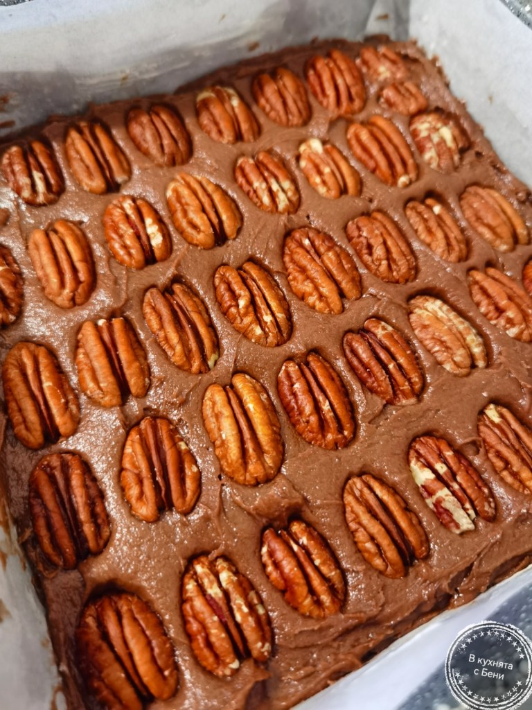 Малка квадратна форма за печене със страна 19,5 см. и височина 5 см. покрих с хартия за печене, която леко намазах с масло. С лъжица насипах сместа, разпределих я равномерно и загладих. Отгоре подредих пекан ядките, като ги притиснах в сместа. Сложих сладкиша да се пече в загрята на 170 градуса фурна за около 20 минути или до видима готовност и суха клечка, прободена в най-високата му част.