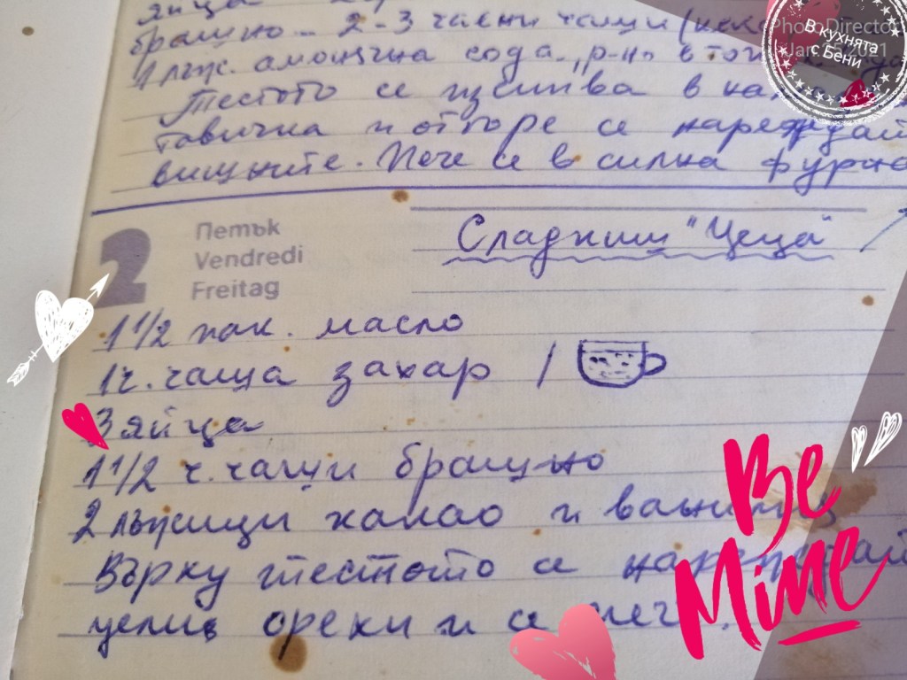 📌На снимката виждате рецептата в тефтера на мама, като тя е за сладкиш в обичайно голям размер. Аз направих половин доза. Ако решите да направите цялата доза, използвайте тава с размер около 28х22см. Самият сладкиш не трябва да бъде висок!