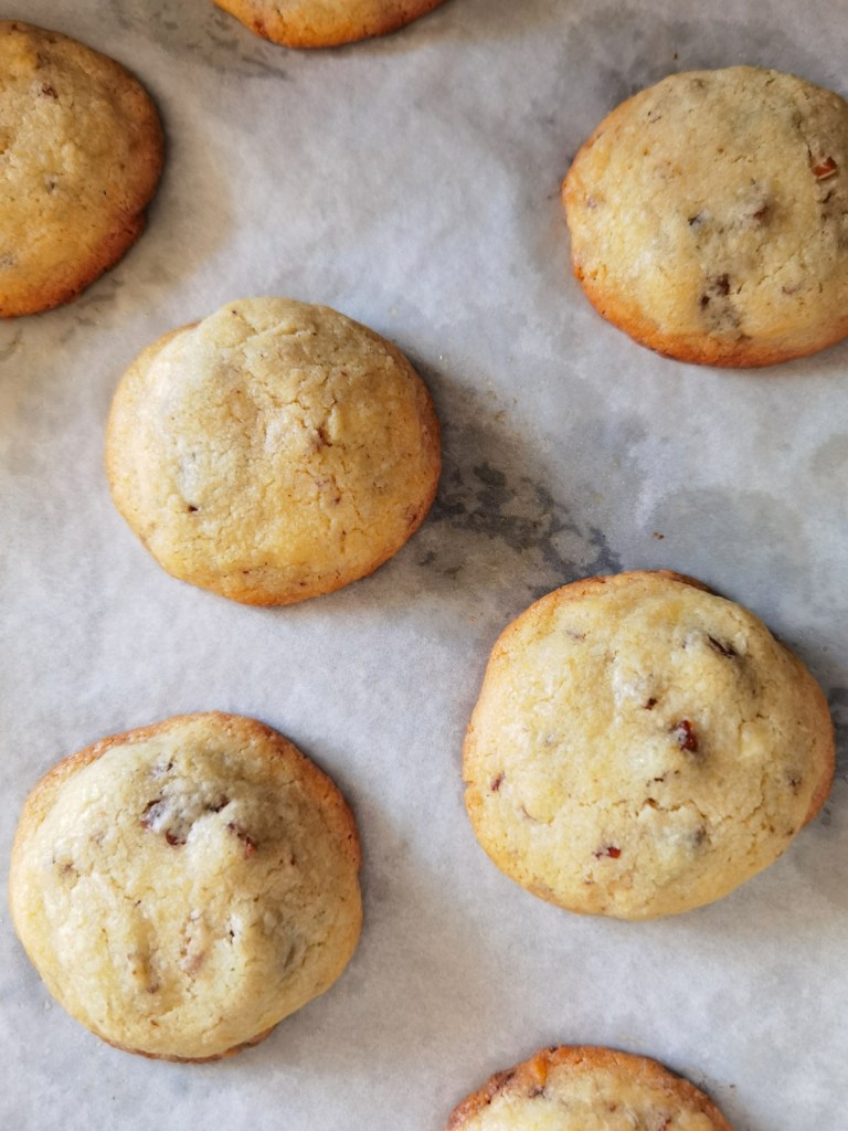 Фурната загрях на 180 градуса. Охладените топчета разположих в тава покрита с хартия за печене на разстояние едно от друго и леко ги притиснах. Пекох ги точно 10 минути, след което извадих тавата от фурната и оставих бисквитите да се охладят за 3-5 минути, тъй като са много меки, но бързо се стягат. Не ги препичайте, за да останат меки!